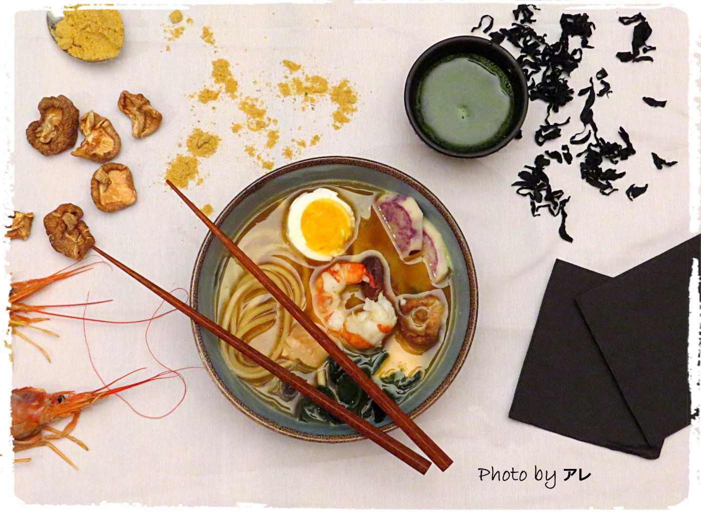 Eccomi al primo post emozionata e felice. Inizio con una composizione che mi sta molto a cuore, perchè richiama la passione di mio figlio per tutto ciò che riguarda il Giappone. La sfida è stata riuscire a preparare una succulenta e speciale zuppa giapponese. Una sorta di Ramen con miso gamberi e molto ancora. Cercando qua e là nel web mi imbatto in nomi esotici e orientaleggianti, prendo nota di tutto e parto per il mio viaggio al supermercato con carrello che regolarmente trovo sgangherato e durissimo da guidare (ma perchè sempre a me?)  perdendomi negli scaffali dell’etnico e finalmente dopo aver sudato sette kimoni e aver scalato (sempre col carrello sgangherato al seguito) tutto il monte Fuji fino alla vetta mi metto ai fornelli. L’uovo, le alghe e i funghi e intanto sul tavolo su una bellissima e candida tovaglia bianca butto a caso gli ingredienti. Ecco che la lampadina si accende: una testa di gambero, qualche fungo, le alghe nere che col bianco spiccano, polvere di zenzero che mi cade a fagiolo e imbraccio la mia adorata Panasonic. Dall’alto, dal basso una tavolozza di colori, le bacchette messe cosi et voilà la zuppa è servita. Cosa dite, in fondo ho solo messo gli ingredienti a caso sulla tovaglia, l’uovo tagliato a metà dà un colore meraviglioso al piatto e il gambero messo bene nel mezzo. Non ci vogliono tante cose, una ciotola, un bicchiere di the verde, delle bacchette! Per altro la zuppa era davvero ottima anche se non ho seguito la ricetta originale mettendoci ciò che il mio gusto mi proponeva.