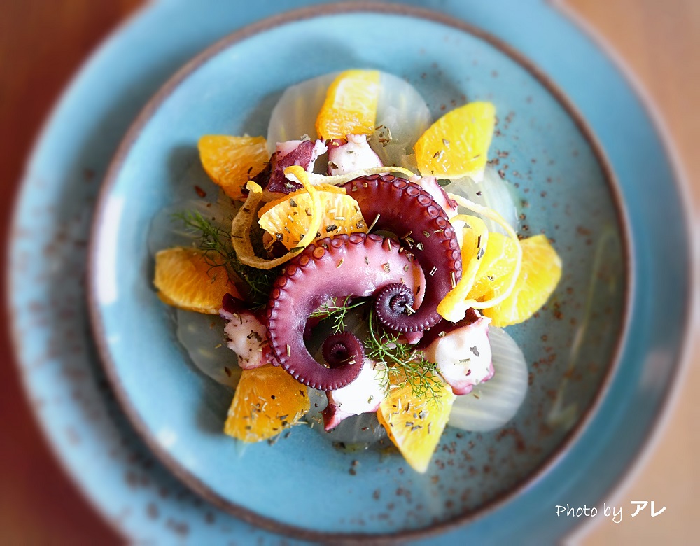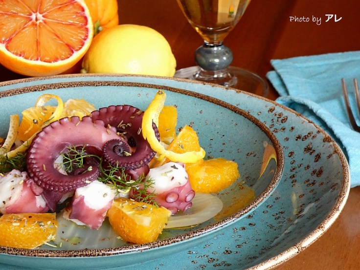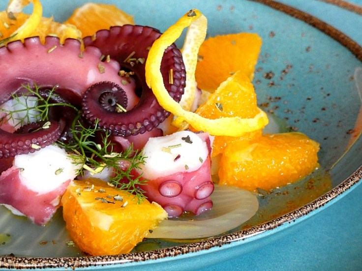 A volte penso a quando ero bambina; certo c’erano ben poche cose con cui giocare e quando andavo al mare dai nonni mi piaceva tantissimo farmi comprare una girandola! Bella, colorata, ma chissà poi cosa ci trovavo a guardarla tutto il giorno girare ad ogni soffio di vento. Un ricordo che mi ha ispirato il prossimo piatto, più che altro mi ha dato lo spunto su come impiattare il polipo, che avevo tanta voglia di cucinare. Inizio col guardarmi in giro nel web, sempre polipo e patate, certo ottimo ma un po’ stancante… Finchè mi imbatto in una ricetta simpatica e inizio. Il polipo, fateci caso, alla fine della cottura presenta delle meravigliose sfumature di viola e rosa, si assottiglia e si arriccia a spirale verso la fine dei suoi tentacoli. Ecco l’ispirazione: creare un piatto girandola, dove spicchi di arancia colorati vanno a fare da contrasto al viola!