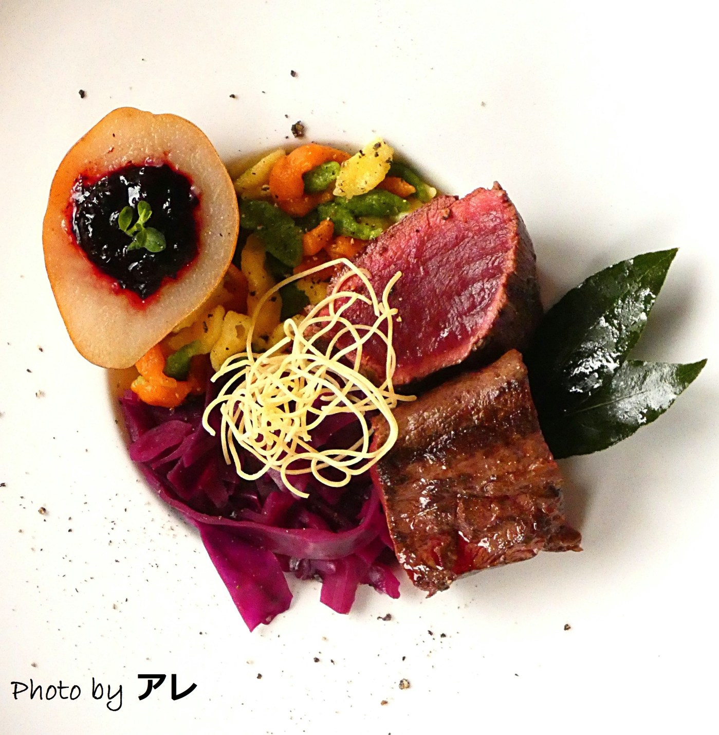 Impiattate con un letto di spatzle colorati (potete passarli prima con una noce di burro), i “crauti rossi”, la mezza pera riempita di marmellata di mirtilli, due grossi medaglioni di cervo, alloro, sale e pepe grattugiato al momento.