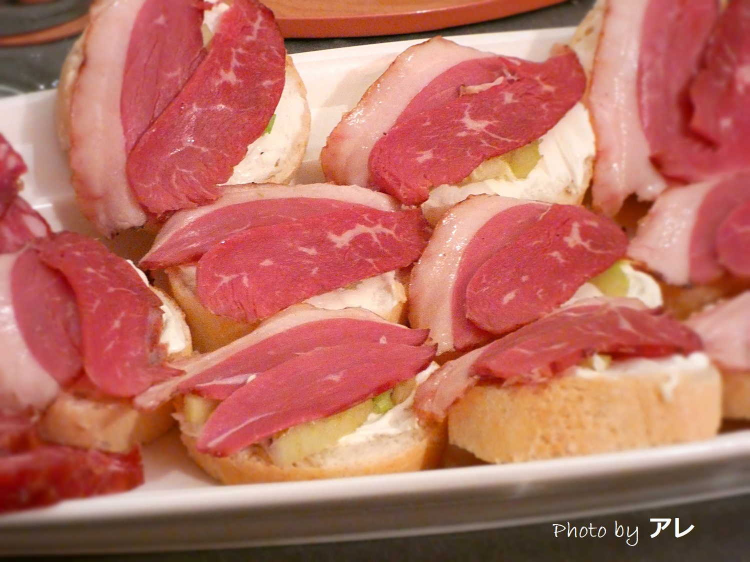 tagliare le baguette a fette non molto alte, spalmare il mascarpone generosamente, aggiungere il sedano tagliato a tocchetti, appoggiare le fette, ce ne vorranno 2 per crostone, di petto d’anatra e di petto d’oca.