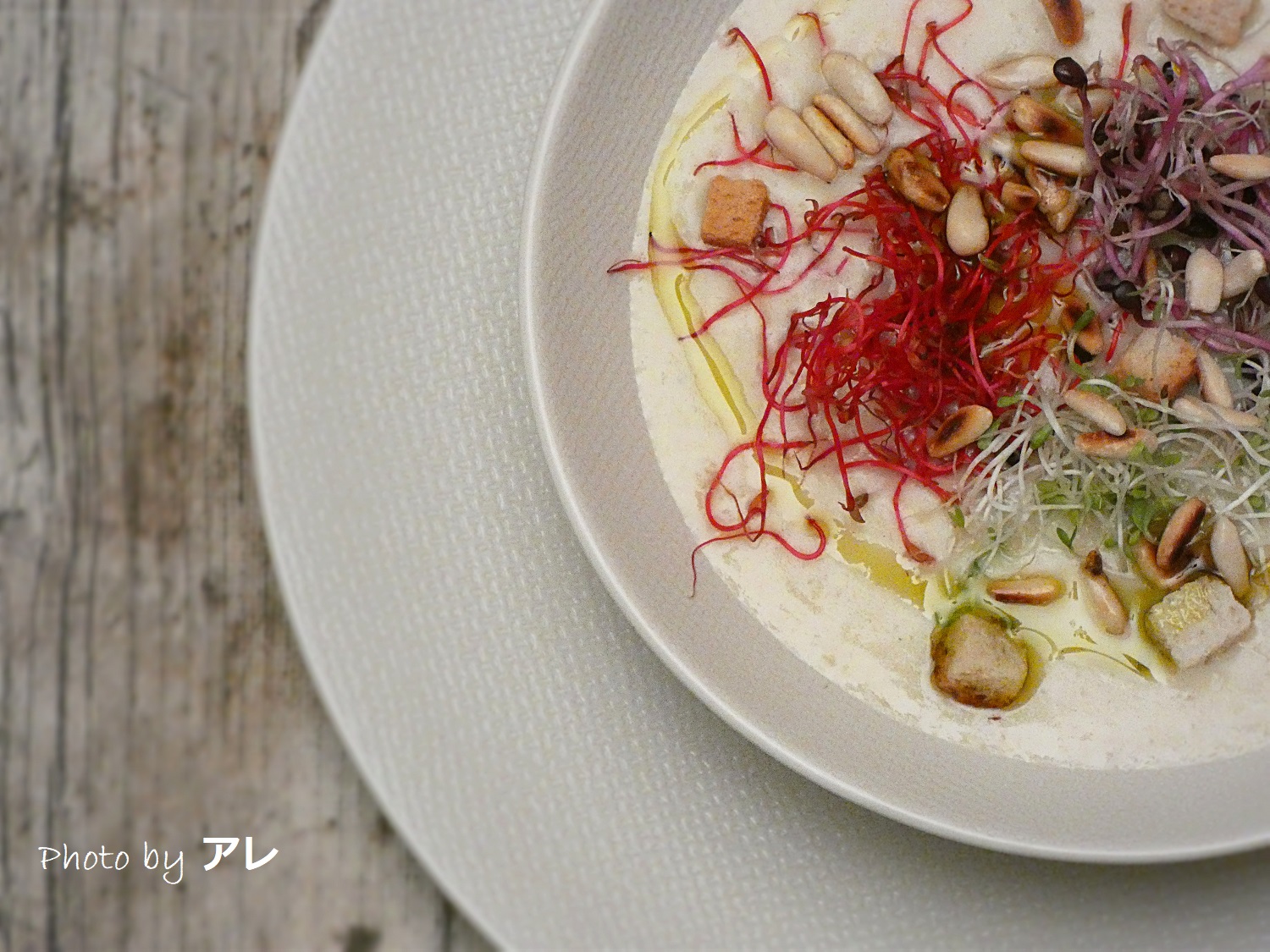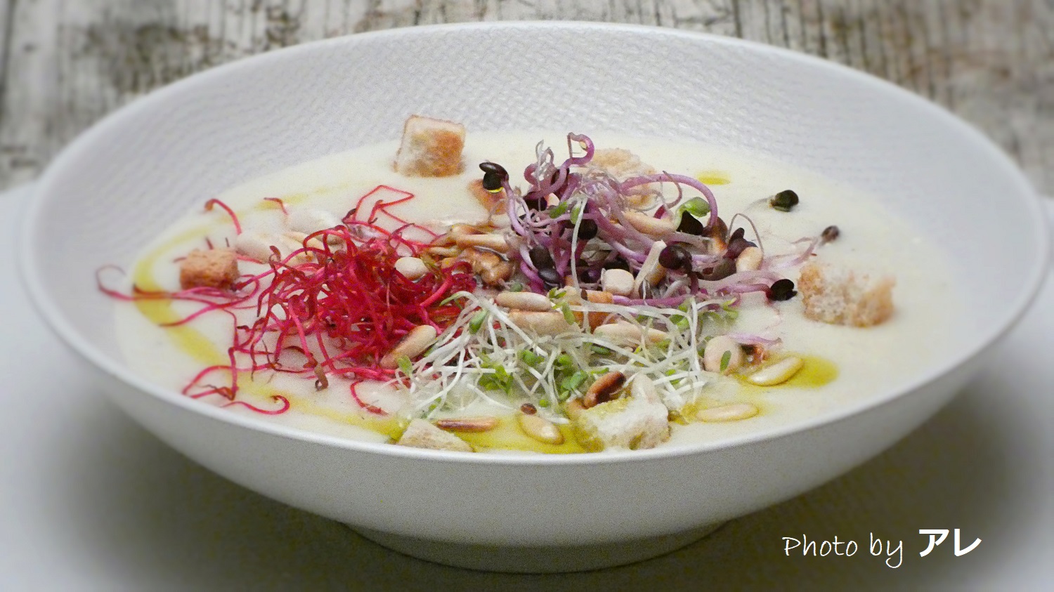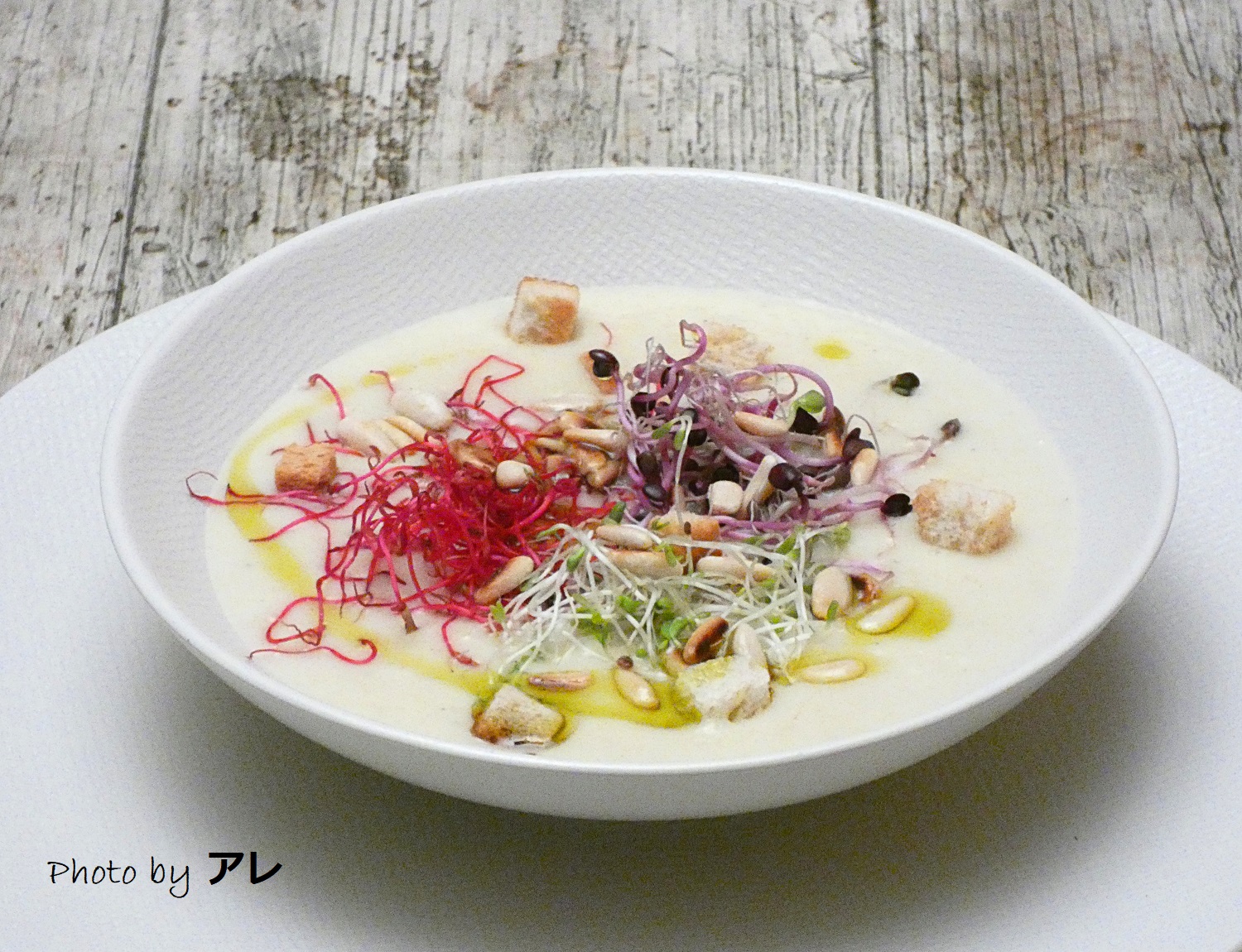 Tagliare lo scalogno finemente e soffriggerlo in un filo d’olio di riso o di noce in una pentola antiaderente dai bordi alti. Lavare e sbucciare le patate ed il sedano rapa. Tagliare tutto in cubetti piccoli e aggiungerli alla pentola con lo scalogno insieme al latte di soia. Dopo circa mezz’ora controllare con una forchetta che i cubetti siano cotti e morbidi, mettere un pizzico di noce moscata e frullare con un frullatore ad immersione fino a raggiungere la consistenza cremosa. Se fosse troppo dura, aggiungere a filo l’olio di riso. Regolare di sale e aggiungere il pepe. Far sobollire ancora qualche minuto intanto tostare i pinoli. Versare nella ciotola e guarnire con germogli, pinoli e cubetti di pane croccante.