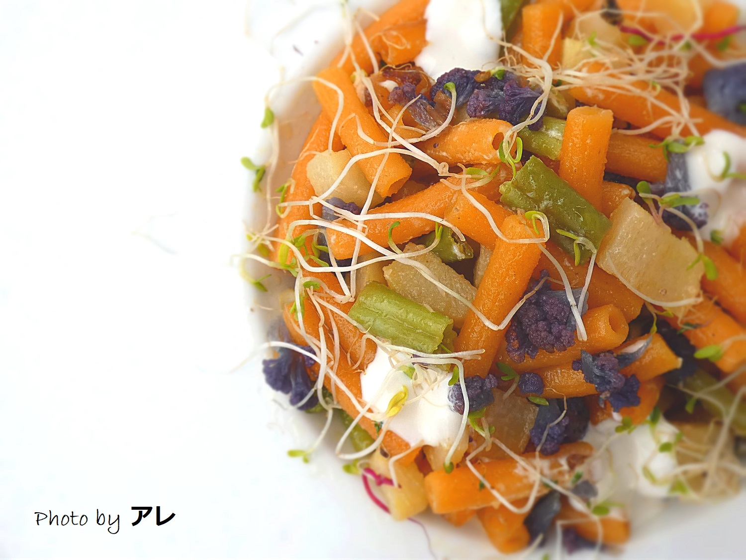 Lessare i sedanini in acqua leggermente salata, tagliare la scorza amara, pelandola e ricavandone dei dadini che metterete in un pentolino con acqua acidulata con il limone. Far bollire la scorza amara per 15 minuti. Immergere gli ultimi 5 minuti anche i fagiolini freschi. Scaldare un filo di olio di noce in un tegamino, sbriciolare il cavolfiore viola e farlo “friggere” nell’olio caldissimo, quando inizierà a colorire, scolare e asciugare le verdure. Tagliare i fagiolini a tocchetti e tuffarli insieme alla scorza amara per pochi minuti nell’olio con il cavolfiore. Scolare i sedanini e metterli nel tegamino, mantecare e versare nei piatti. Cospargere con germogli di alfalfa e aggiungere un tocco di panna vegetale fredda.