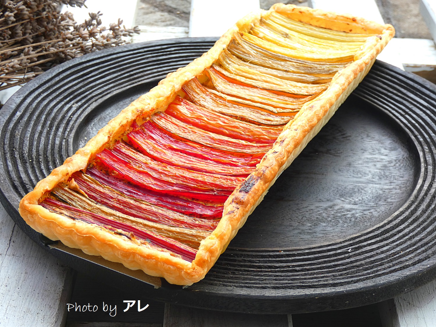 In una pentola far bollire dell’acqua leggermente salata, tuffare le bietole colorate, i gambi e un paio di foglie. Stendere il rotolo di pasta sfoglia in uno stampo rettangolare da crostata, rifilando i bordi. Punzecchiare con una forchetta. Dopo 5 minuti scolare solo le foglie, asciugarle per bene e tritarle finemente, lavorare la ricotta con il trito, il pepe e la granella di pistacchi, disporre la crema sulla base di sfoglia, versare a filo l’olio extra vergine. Scolare anche i gambi, asciugarli bene, tagliarli tutti della stessa dimensione prendendo a riferimento il lato corto dello stampo. Disporli come vi suggerisce la fantasia, io ho preferito seguire la gamma cromatica! Spennellare di olio. Cuocere a 180°C in forno preriscaldato per 20 minuti circa.