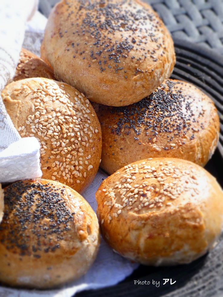Mettere i panini a lievitare in forno spento con luce accesa, lasciare riposare fino al raddoppio del loro volume. Una volta lievitati, spennellarli con un tuorlo sbattuto diluito con 1 cucchiaio di latte e cospargerli di semi a piacimento; quest’operazione servirà per rendere la superficie lucida e dorata e per permettere ai semi di sesamo e di papavero di attaccarsi.