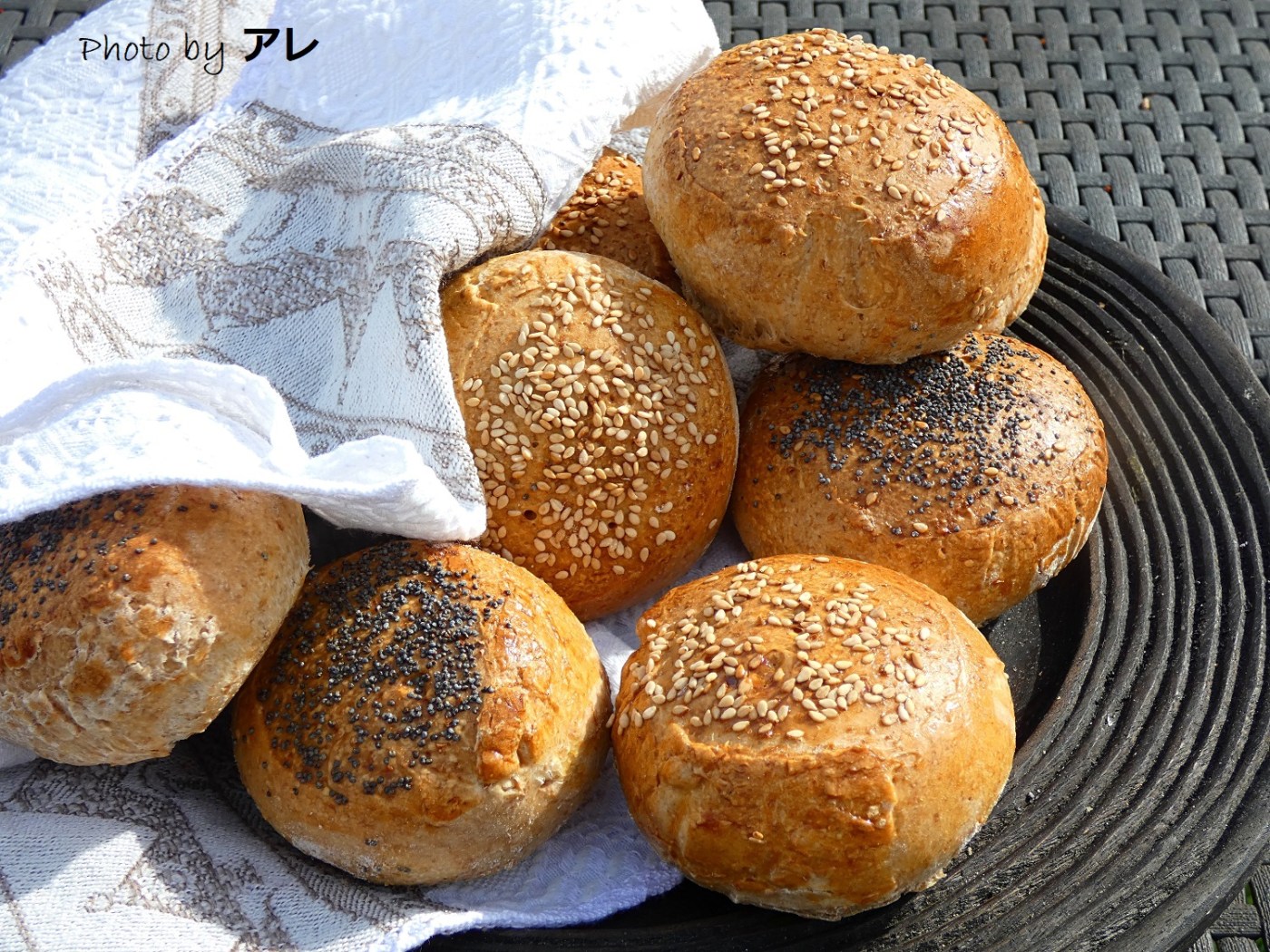 Mettere i panini a lievitare in forno spento con luce accesa, lasciare riposare fino al raddoppio del loro volume. Una volta lievitati, spennellarli con un tuorlo sbattuto diluito con 1 cucchiaio di latte e cospargerli di semi a piacimento; quest’operazione servirà per rendere la superficie lucida e dorata e per permettere ai semi di sesamo e di papavero di attaccarsi.