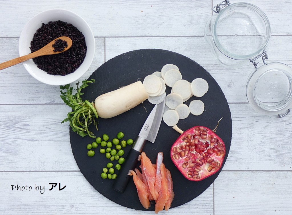 Versare il riso in un vasetto da litro, unite un cucchiaio di olio, un pizzico di sale e l’acqua. Mescolare molto bene. Tagliare i filetti di trota a striscioline, e sgranare la melagrana. Tagliare a rondelle sottilissime il ramolaccio o daikon e mettere da parte. Programmare il microonde a 750 watt per 5 minuti, inserite il vasetto e avviare. Al termine della prima fase di cottura, aiutandovi con un canovaccio, agitare delicatamente il vasetto. Aspettare un attimo, reinserire il vasetto nel microonde e programmare per altri 5 minuti a metà della potenza (350 watt). Togliere, sganciare il gancio del vasetto, rimettere nel microonde per 2/3 minuti in modo che il coperchio si sollevi da solo. Estrarre, aggiungere tutti gli altri ingredienti nel vaso con il riso, chiudere e agganciare. Riposizionare nel microonde per 5 minuti alla massima potenza. Ultima fase è estrarre il vaso e lasciar riposare per circa 20 minuti, in modo che la cottura prosegui.