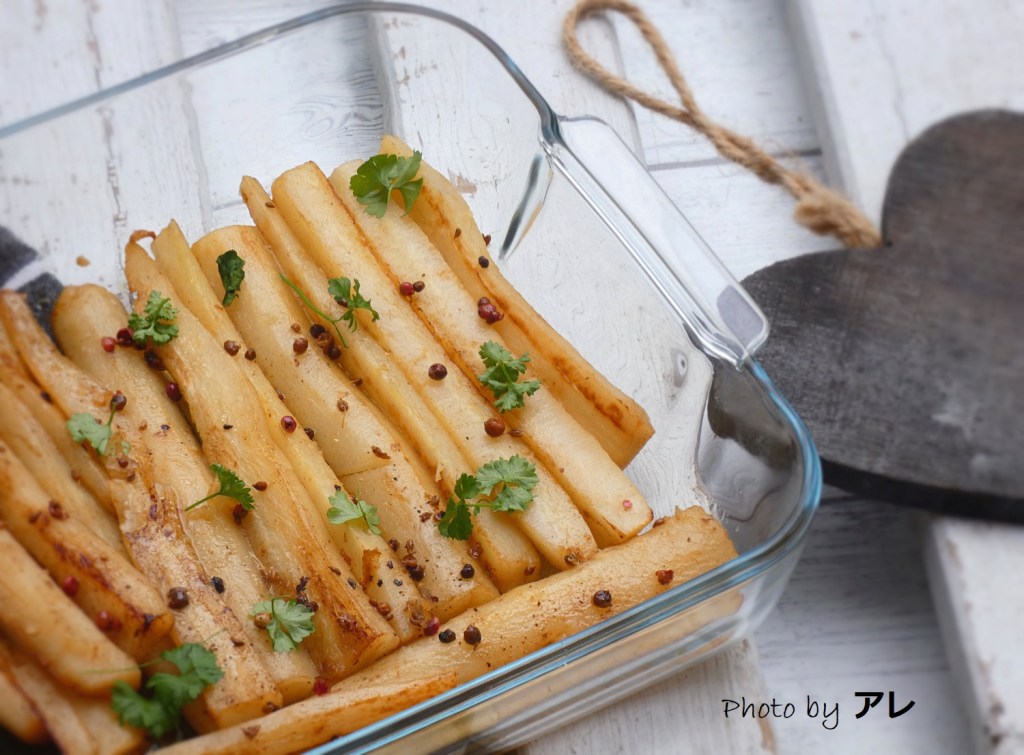 Pelate le radici, dividetele in bastoncini non troppo piccoli e lessatele in acqua con limone e due cucchiaini di zenzero in polvere. Cuocetele al dente, basteranno 5 minuti, scolatele e disponetele su una pirofila con un filo d’olio extravergine d’oliva e abbondanti fiocchi di burro di malga. Cospargete di grani di pepe rosa, prezzemolo, sale e pepe e cuocete in forno a 200° per 15-20 minuti. Potete aggiungere a piacere, lamelle di mandorle, pinoli o semi di finocchio.