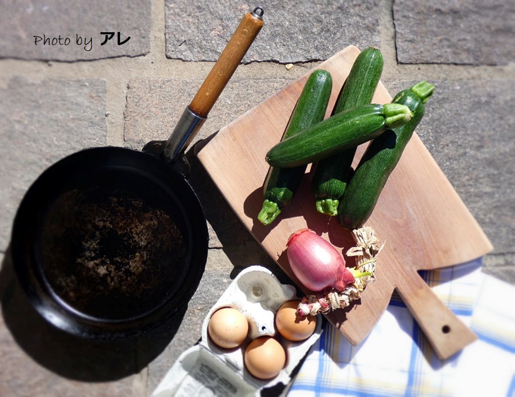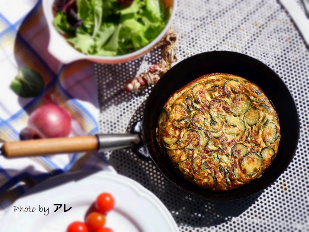 Sbucciare, lavare e tagliare la cipolla finemente e farla rosolare in un tegame abbastanza grande da contenere tutte le zucchine tagliate a rondelle senza che si sovrappongano troppo. Rosolate bene le verdure fino a che le vedrete cotte ma intere e non disfatte. In una ciotola rompete le uova, sbattetele pochissimo con una forchetta e un pizzico di sale, state attente di non incorporare aria nelle uova. Aggiungete al composto, le verdure che avrete fatto però raffreddare bene prima. In un padellino più piccolo, unto bene di olio, aggiungete la frittata e qui inizia il piccolo trucco: con un cucchiaio di legno, dalla parte convessa, continuate a premere sui bordi della frittata creando un rotondo perfetto. Girate tutt’attorno alla frittata, come se voleste “rimboccare” i bordi, con movimenti veloci e precisi. Dopo pochi minuti, aiutandovi con un coperchio voltate la frittata e proseguite la cottura rifinendo sempre i bordi. Voltatela almeno ancora 2 volte in modo da farla cuocere molto bene, lentamente da entrambe le parti finchè la vedrete soda e dorata. Tenete sempre la fiamma bassa e “alla vecchia maniera” con uno stecchino, fate la prova se il suo interno è bagnato o asciutto. Nel primo caso lasciatela cuocere ancora, il secondo caso invece è indice di cottura perfetta!