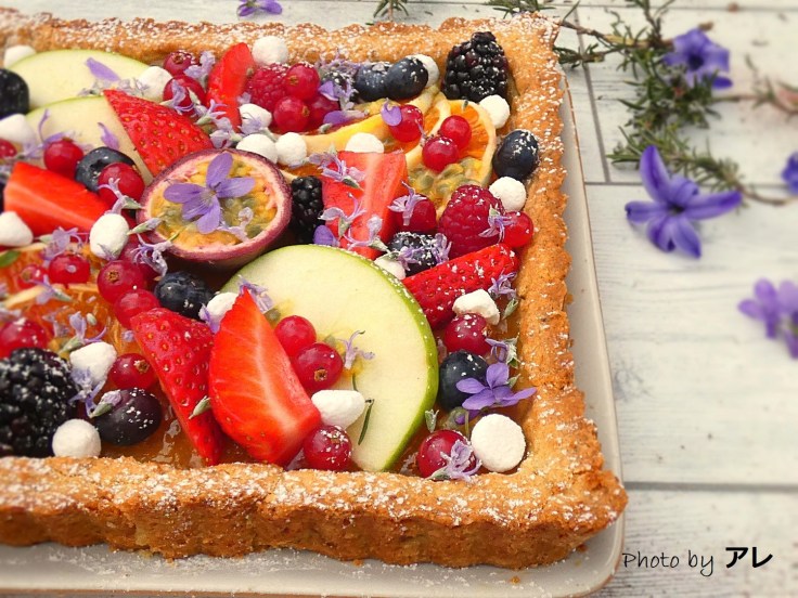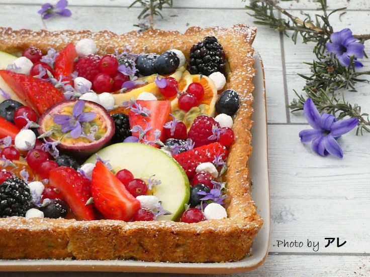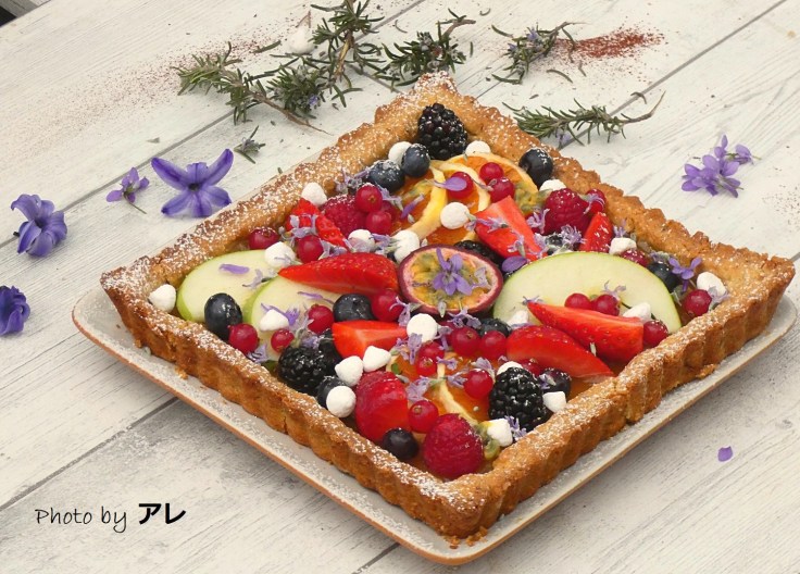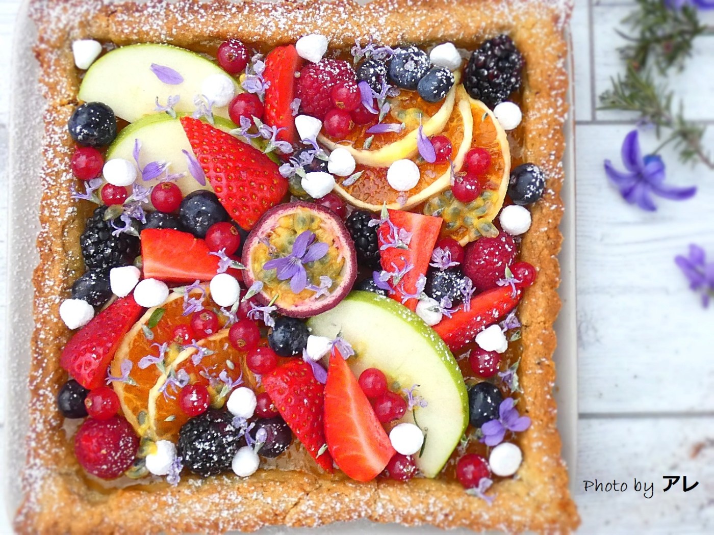 Dopo aver preparato la frolla, (vedere qui) avvolgetela nella pellicola e lasciatela riposare. Pulite, lavate e asciugate la frutta. Cuocere la frolla in bianco e lasciatela raffreddare. Stendere un velo di marmellata sul fondo e aggiungere la frutta come preferite, con un quadro da dipingere, come vuole la vostra fantasia. Spruzzare la gelatina spray per evitare che la frutta annerisca, cospargete di fiori di rosmarino e piccole meringhe, spolverizzate di zucchero al velo.