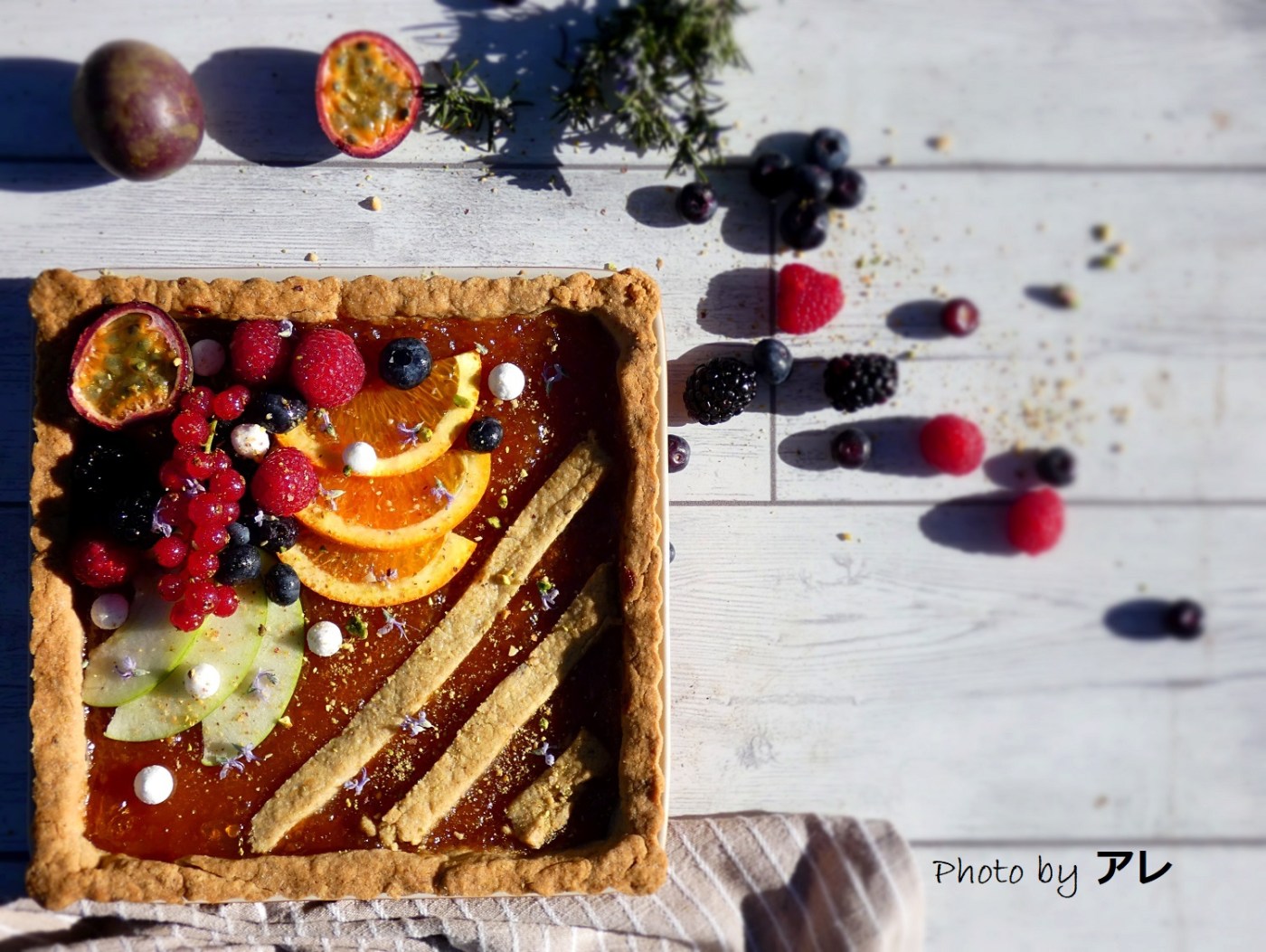 Dopo aver preparato la frolla (vedere qui) avvolgerla in pellicola e tenerla da parte in luogo fresco. Lavare e asciugare la frutta che preferite, vanno bene, frutti di bosco o fragole, mele, arance e limoni. Stendere la frolla lasciandone da parte un pezzetto e ricoprire uno stampo quadrato dai bordi non troppo alti. Spalmare tutta la marmellata e cospargere con un pizzico di cardamomo e i pezzetti di pistacchio tritato. Intrecciare con la pasta avanzata delle strisce o preparare delle stelline o cuoricini con gli stampini da mettere sulla marmellata qua e là. Infornare a 180° per 30 minuti. Fare la prova con lo stecchino se la pasta è ben asciutta. Una volta che la torta è fredda, aggiungere la frutta fresca in un angolo della torta e spruzzatela di gelatina spray per non farla annerire.
