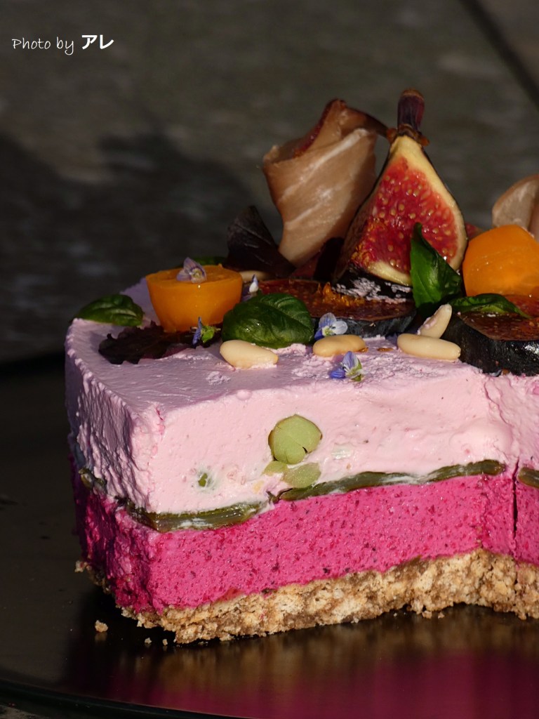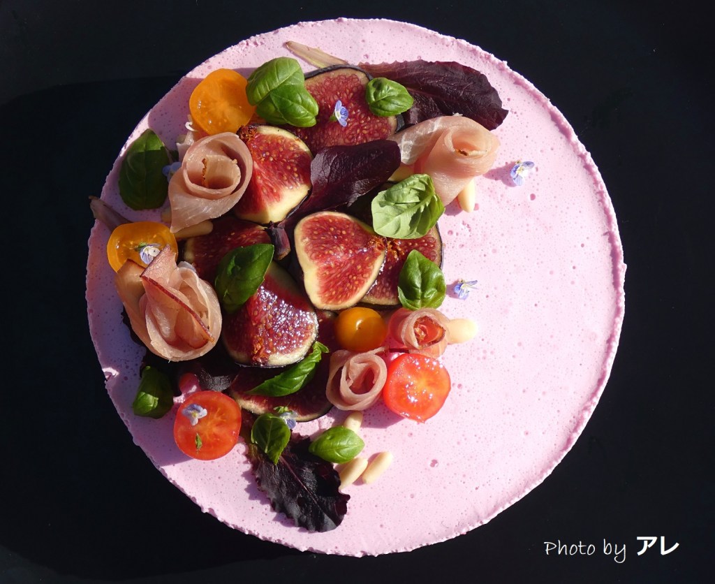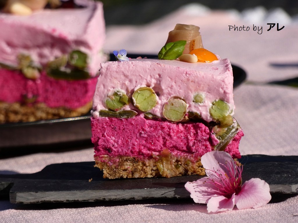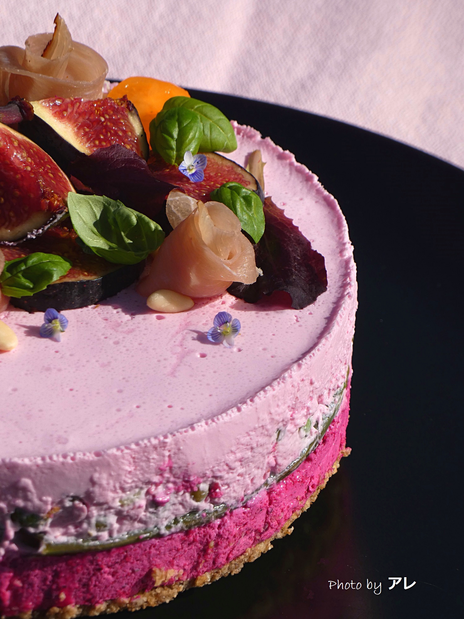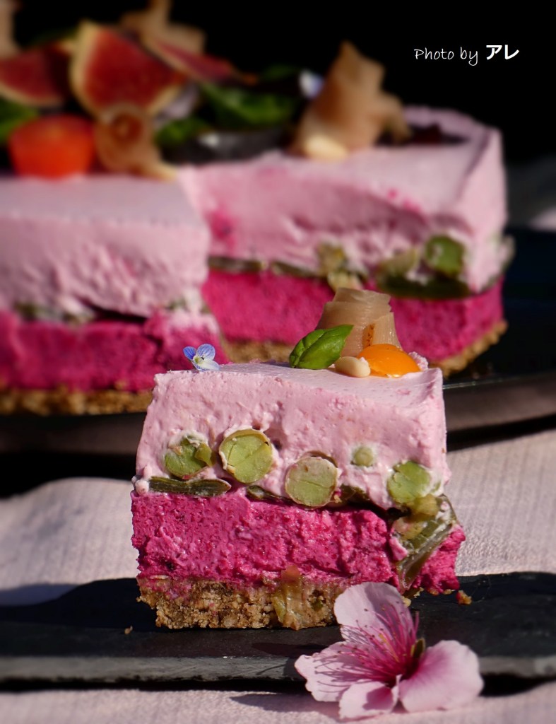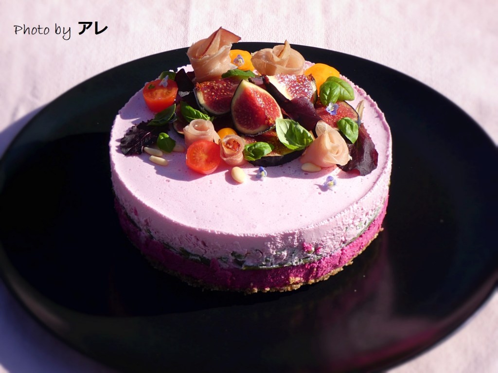 Iniziare con la base, tritare in un frullatore i taralli e i grissini, trasferiteli nella tortiera a cerniera ricoperta sul fondo di carta da forno. Versate sui taralli il burro sciolto e qualche goccia di aceto balsamico. Schiacciare bene la base e metterla in frigo. Lessare in acqua leggermente salata le taccole e i piselli, ci vorranno circa 10/15 minuti. Nel frattempo, tritate una barbabietola e mezza nel frullatore, aggiungere il formaggio spalmabile e creare una crema dal colore brillante. Sciogliere un foglio e mezzo di gelatina in acqua fredda, scaldare 15 ml di panna e velocemente sciogliervi la gelatina ben strizzata. Aggiungerla al composto di barbabietola. Tenere da parte. Preparare ora l’altra crema seguendo esattamente gli stessi passaggi di prima, ma utilizzando solo la mezza barbabietola avanzata. La crema avrà un colore molto più delicato, sul rosa. Riprendere la base, spalmare la prima crema più colorata, appoggiare le taccole vicine tra loro ricoprendo e facendo uno strato perfetto, aggiungere i piselli e ora l’altra crema rosa. Riportare tutto in frigo per almeno due ore. Prima di portare la cheesecake in tavola decorarla con fichi tagliati in 4 parti, basilico, pinoli, pomodori e roselline di prosciutto crudo o speck.