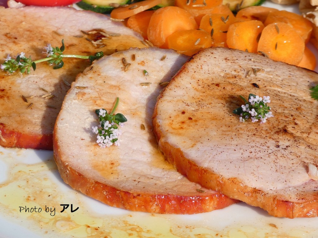 Sciogliere il burro in una padella capiente, che possa contenere le fette senza sovrapporle. Appena spumeggia, appoggiare le fette di carrè, cospargerle di qualche seme di cumino, cuocerle 2 minuti per lato, aspettare che si formi un sughino denso, servirle calde con il sugo. Non serve aggiungere sale.