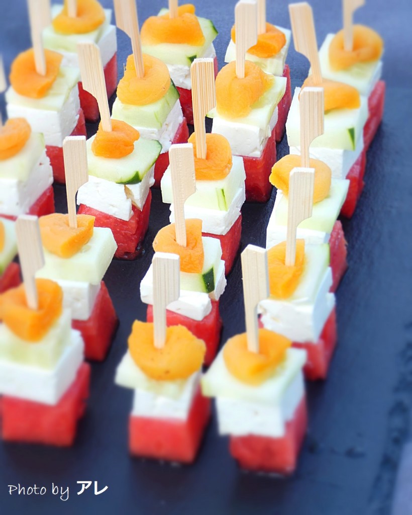 ritagliare tutti gli ingredienti a cubetti, alternare il formaggio feta, all’anguria, il cetriolo e l’albicocca fresca