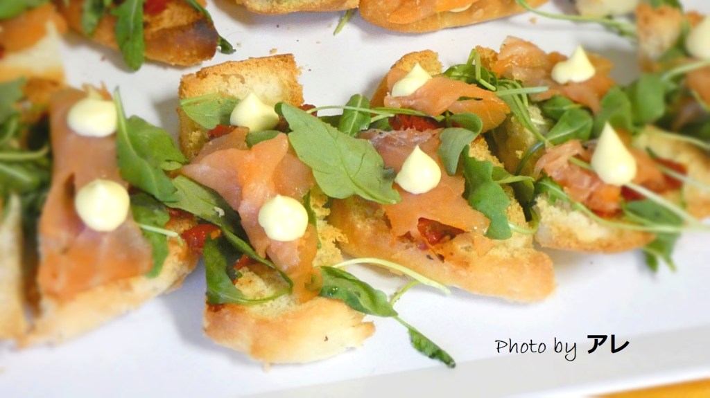 tagliare il pan focaccia in orizzontale, ricavare alcune fettine da passare i forno e rendere croccanti, guarnire con pomodorini secchi, salmone affumicato, rucola e ciuffi di maionese