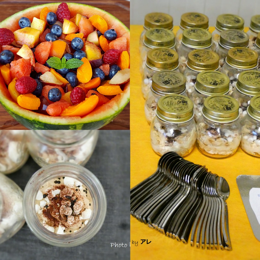 scavate l’anguria e ricavate dei cubetti, unite le pere, il melone, i lamponi, i mirtilli, la pesca, l’uva fragola nera. Preparate un’emulsione con acqua, zucchero e limone e versate sulla frutta. Guarnite con menta fresca