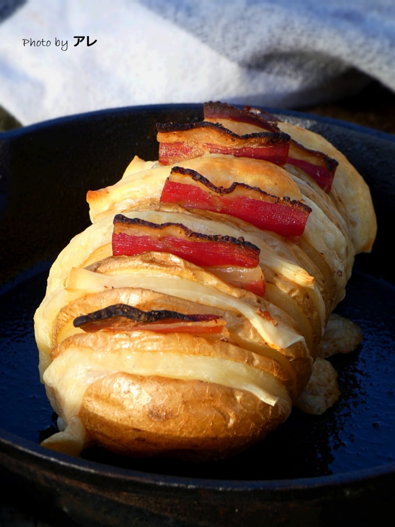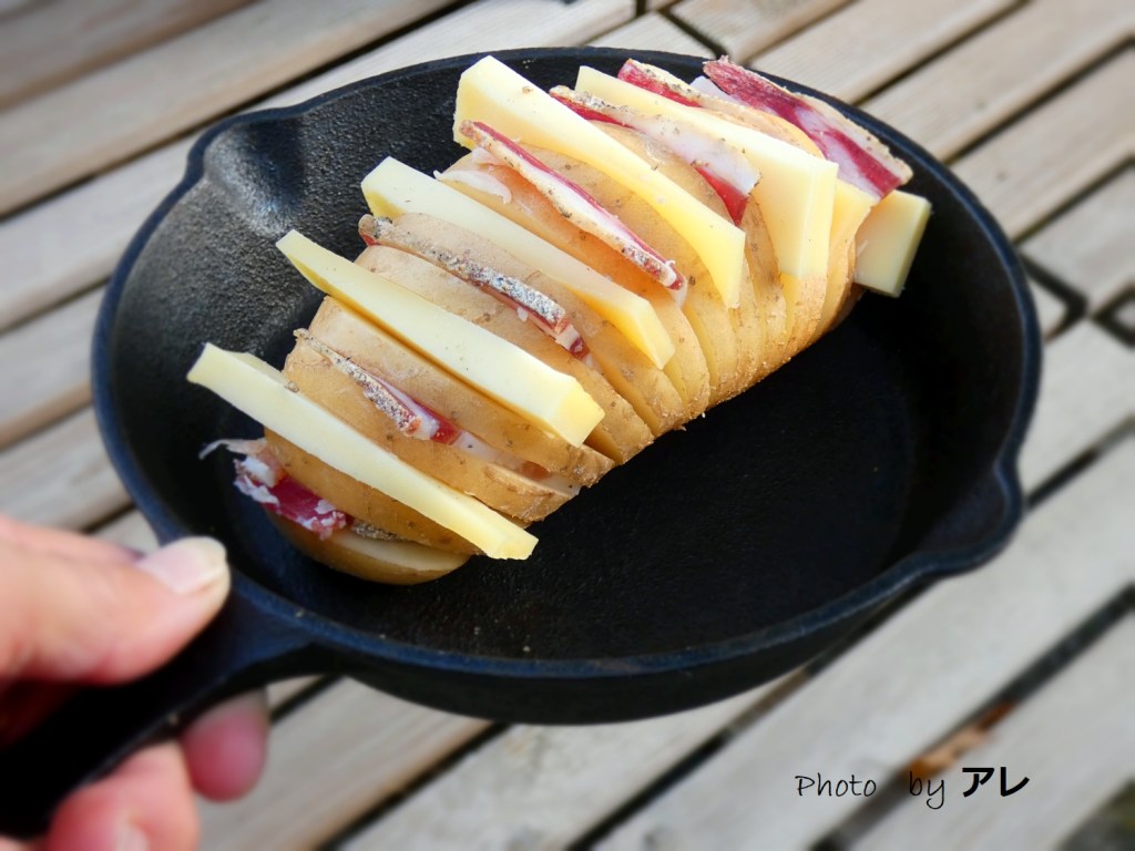 Bollire le patate intere con la buccia, dopo averle pulite molto bene e immerse in acqua leggermente salata, in una padella capiente per almeno 15/20 minuti dal bollore a seconda della grandezza delle patate. Dovranno essere morbide ma molto sode. Preparate le patate come descritto nel mio post “Patate, Olanda e la lotta con i mulini a vento“. Tagliare a fette la pancetta e a fette anche il formaggio. Tra una fetta e l’altra delle patate alternare le fettine di pancetta e le fettine di formaggio. Appoggiare in un padellino di ferro e mettere nel forno a 200° per 30 minuti o fino a quando il formaggio sarà ben sciolto e colorito.