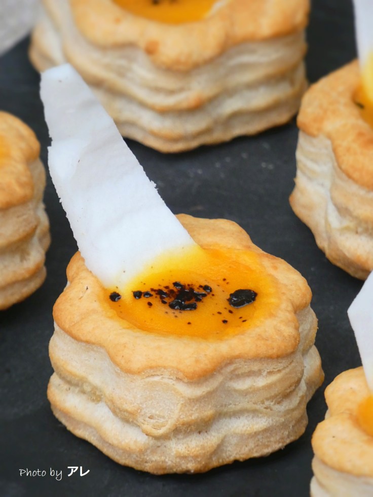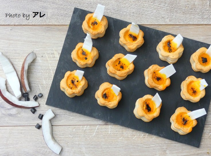 Srotolare la pasta sfoglia e con un coppa pasta a fiore o rotondo di circa 5 cm di diametro ritagliare 48 dischi; adagiare 12 dischi distanziati su una teglia rivestita di carta da forno e incidere i restanti 36 con un coppa pasta tondo del diametro di 4 cm, formando degli anelli. Spennellare la base con il latte, bucherellare con i rebbi di una forchetta e adagiarvi sopra 3 anelli di pasta, spennellando ogni volta con il latte; cuocere i vol au vent in forno già caldo a 200° per 10 minuti, fino a che saranno gonfi e dorati. Nel frattempo tagliare la zucca a pezzetti e metterla in una padella con il burro fuso, mescolare e poi aggiungere tre cucchiai di acqua, cuocere per circa 10 minuti mescolando spesso. Passare la zucca al setaccio e mettere la purea in una ciotola. Aggiungete il sale, il pepe e riportatela sul fuoco lieve fino a che i vol au vent saranno pronti. A quel punto versatela nel loro interno caldissima, spolverizzatela con un pizzico di liquirizia frantumata dalle codette e impreziosite il vostro piatto con sfoglie di cocco ricavate dalle fette fresche!