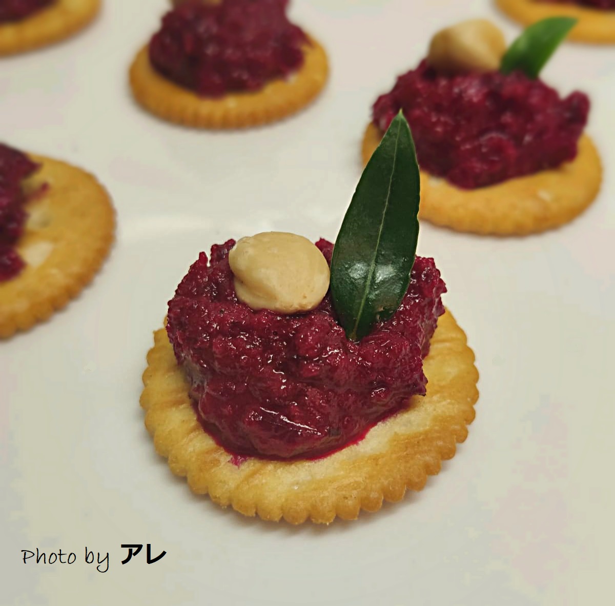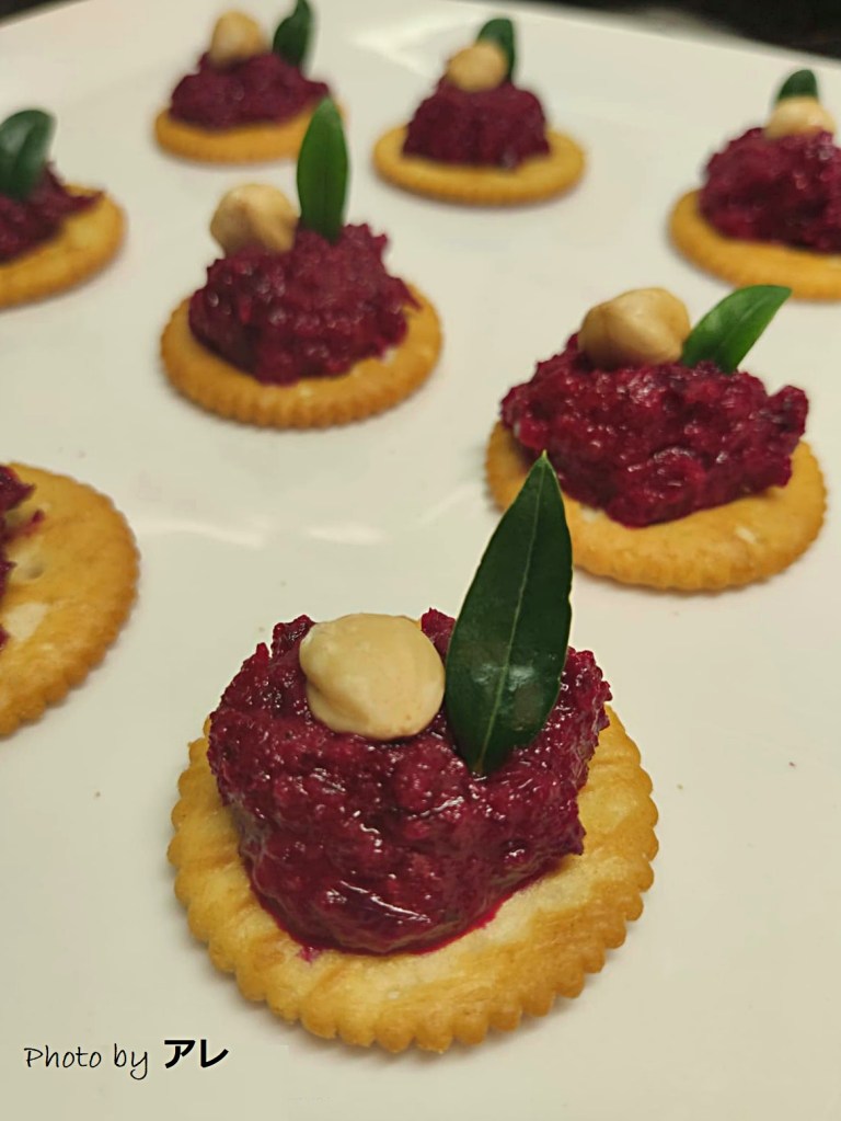 Procedimento: in un mixer riunite la rapa rossa già lessata tagliata a tocchetti, il pangrattato e a filo l’olio e frullare fino ad ottenere una purea. Aggiungere un cucchiaio di pangrattato e un pizzico di pepe. Distribuire sui cracker la crema ottenuta e guarnire con una nocciola e una fogliolina di mirto.