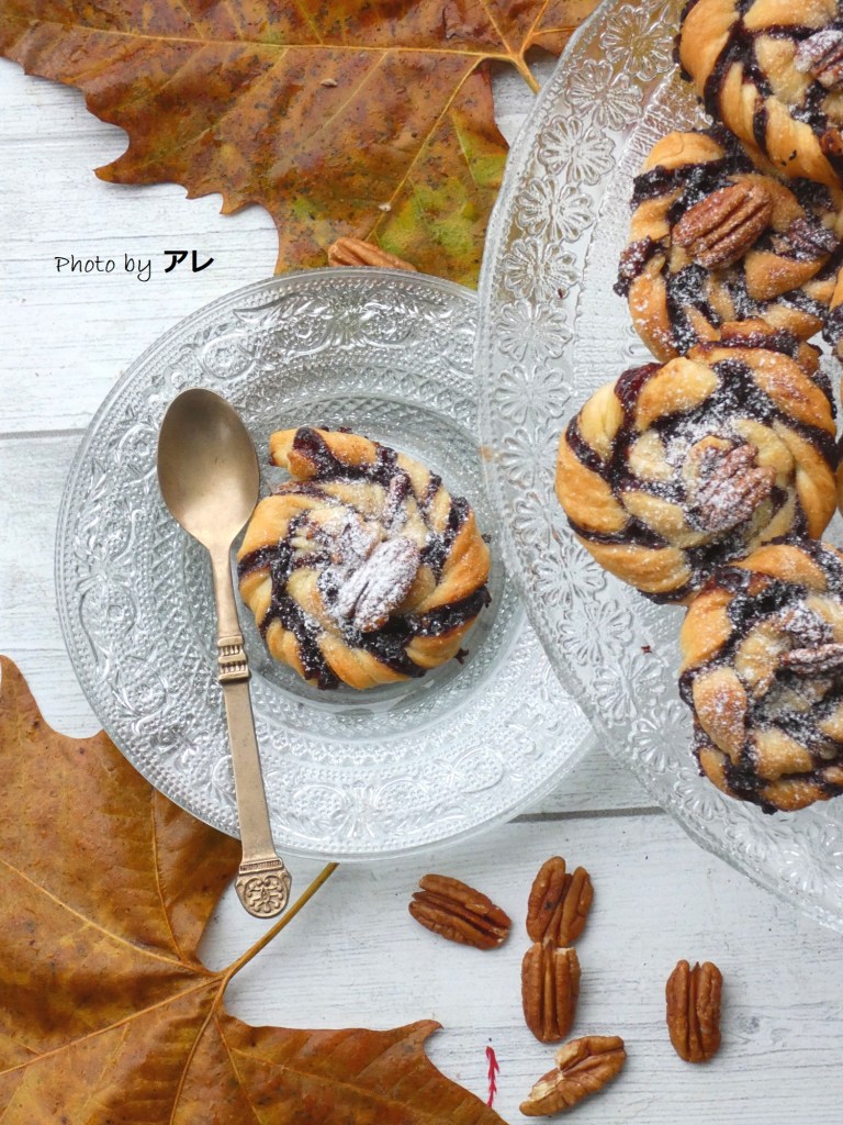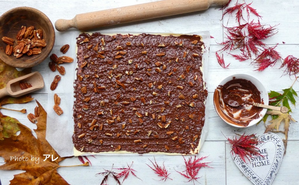 Srotolare il primo rettangolo di pasta sfoglia, sciogliere nel microonde per pochi secondi la crema di nocciole e miscelarla con alcune noci pecan ridotte a granella.