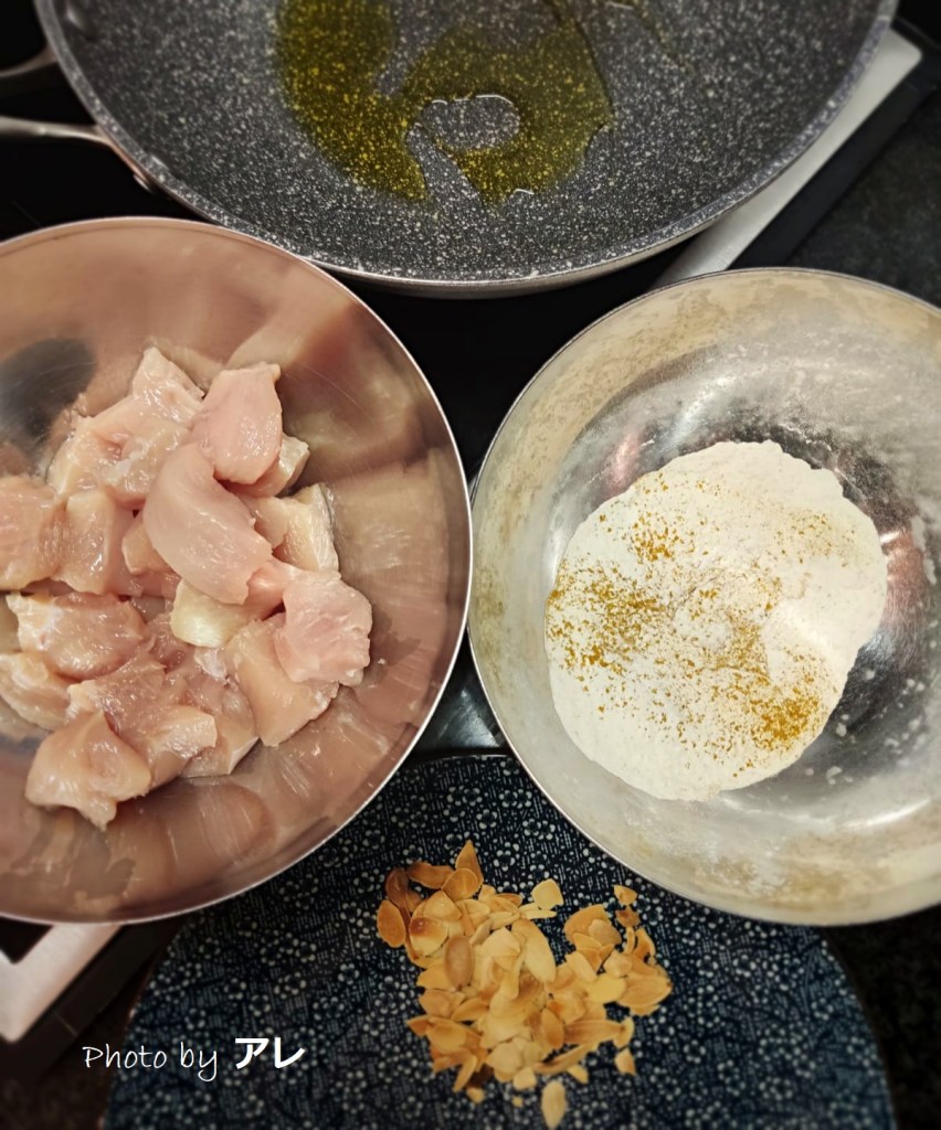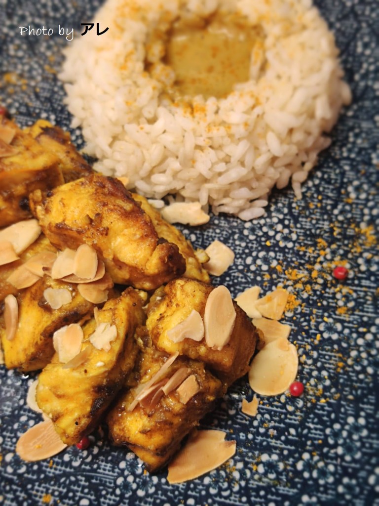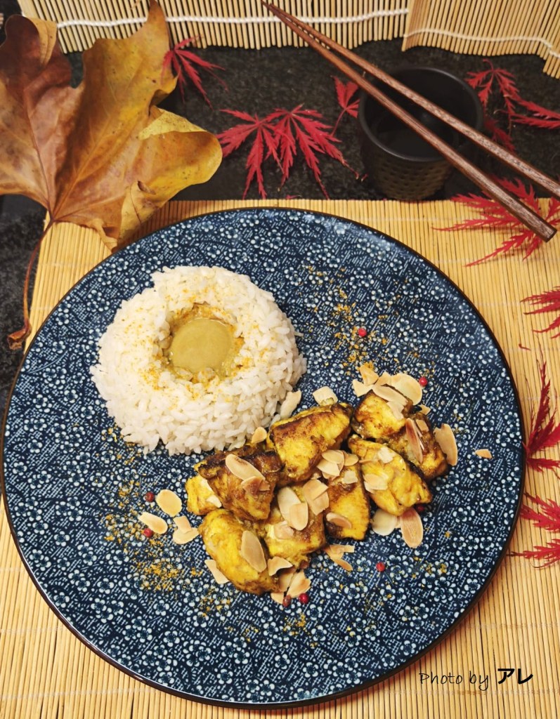 Cuocere il riso in acqua salata per 5/8 minuti, poi scolare e passare sotto l’acqua fredda. Stendere su di una teglia e passare in forno ventilato a 90°. Mettere le mandorle su carta da forno, spargere un pizzico di sale e far colorire anch’esse in forno. Tagliare il pollo a cubetti grandi circa una noce o poco più, mischiare la farina con un cucchiaio di curcuma e un cucchiaio di curry e infarinare il pollo generosamente. Ungere la padella antiaderente con un pochissimo d’olio, cuocere il pollo a fuoco normale. Abbassare la fiamma, girare il pollo e lasciare per almeno 10 minuti. Intanto preparare un pentolino con la stessa quantità (regolatevi con un grosso cucchiaio) di: 1 parte di aceto balsamico, 1 parte di vino, 2 parti d’acqua, 4 cucchiai di panna vegetale, un cucchiaino di curcuma e uno di curry e fare sobollire. Impiattare il riso, con il sughetto nel centro e il pollo di lato con le mandorle.
