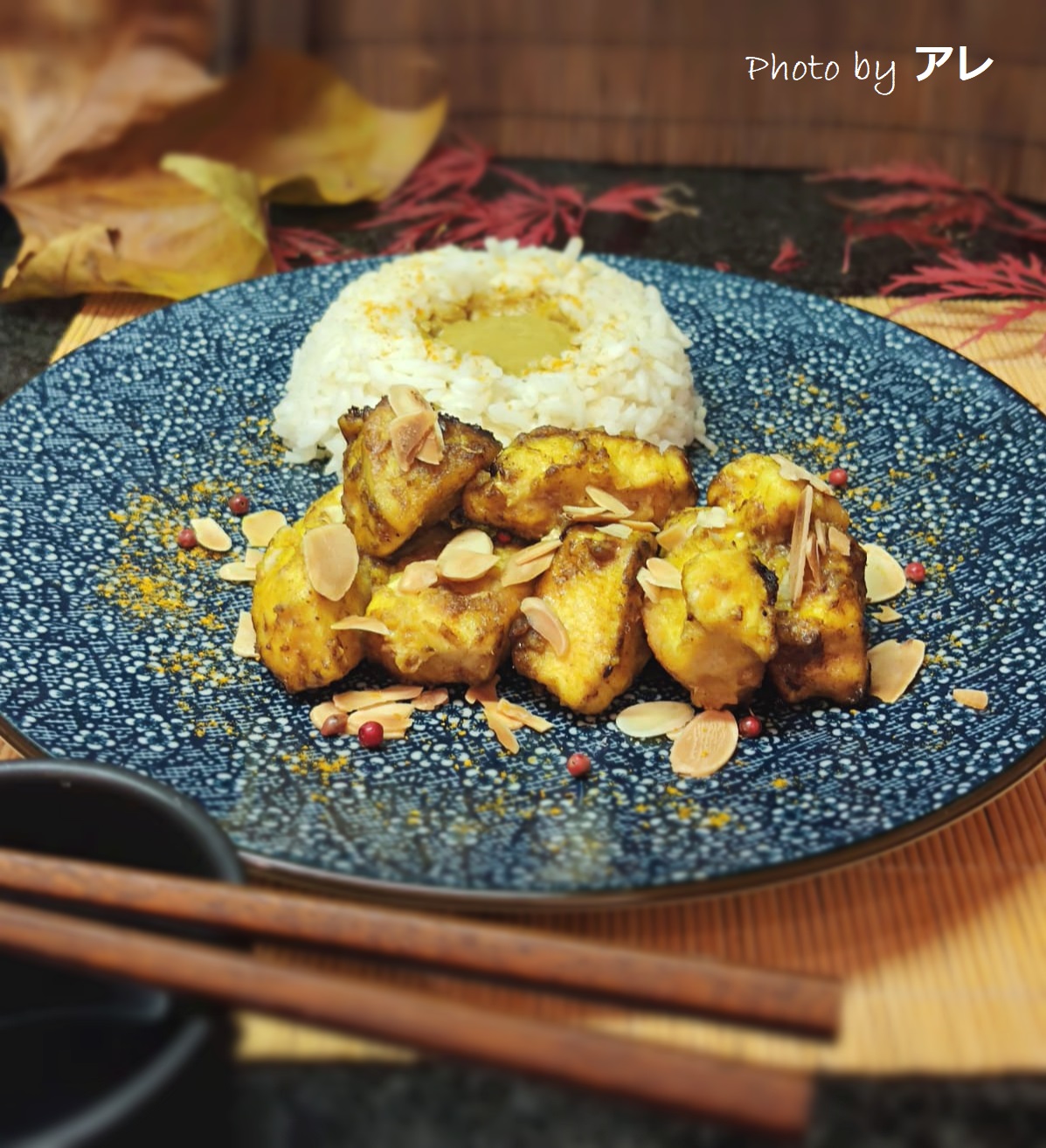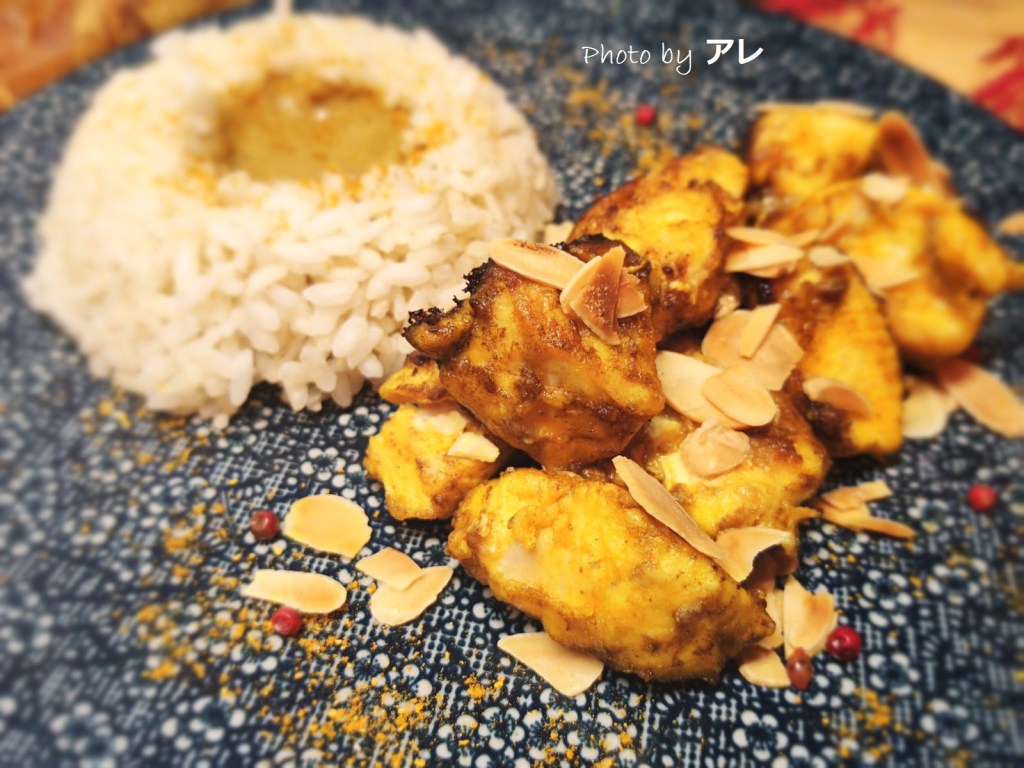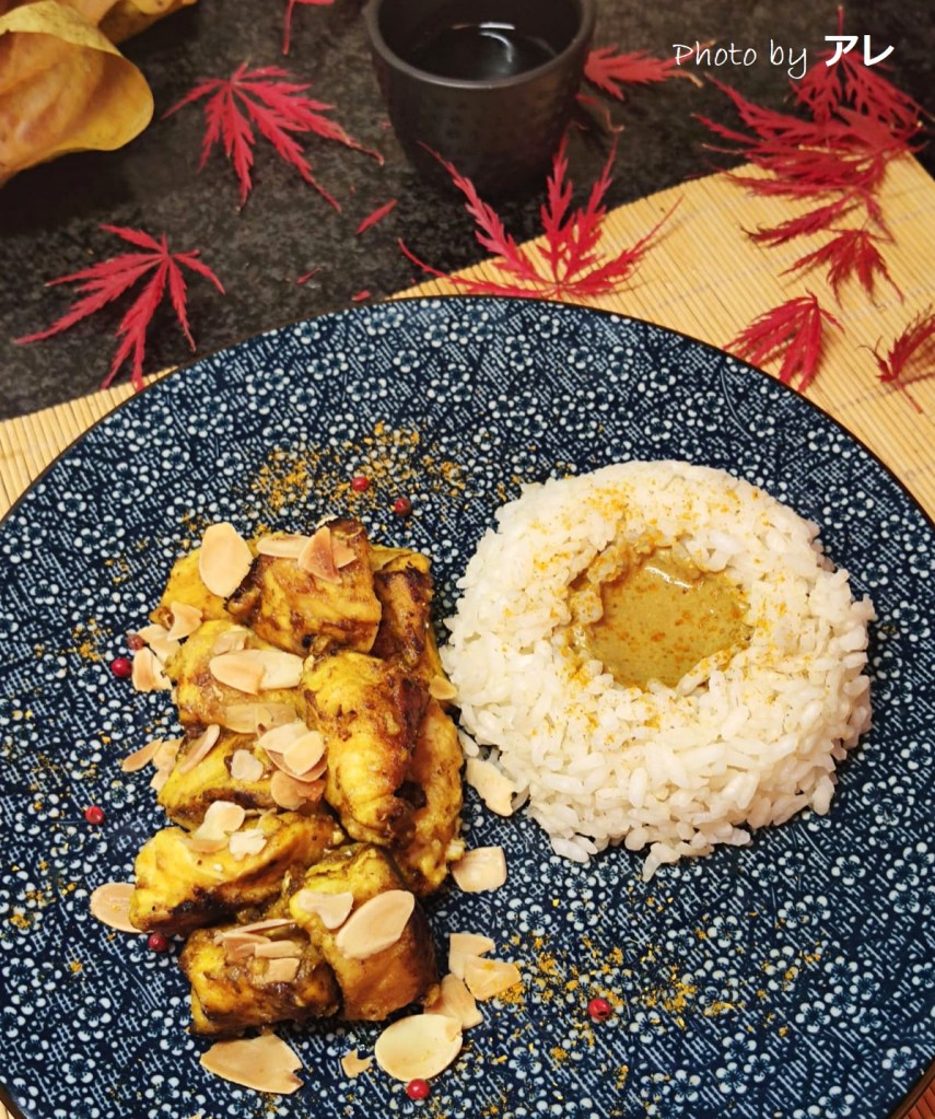 dividere un tantino le cose nel piatto, crea un effetto del tutto nuovo per un pollo al curry che tutti idealizzano come uno spezzatino col sugo sul riso. I cubetti ci sono, ma quasi croccanti e attorniati dalle mandorle, il riso c’è ma colorato di delicata crema al curry.