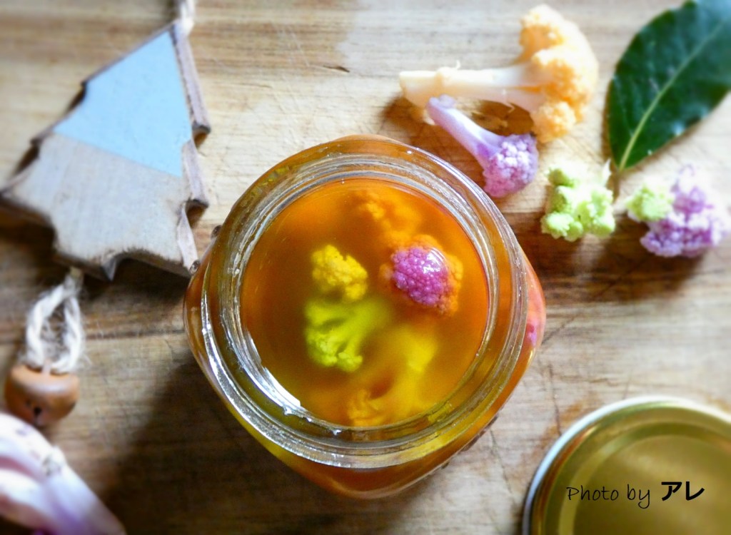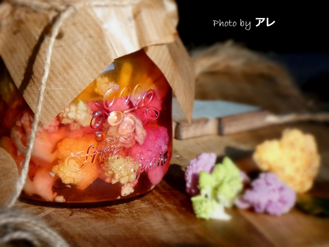 Staccare le cimette dal cavolfiore intero e sciacquatele. Mettere in una casseruola tutti gli ingredienti e portate a bollore. Far cuocere 10 minuti e poi scolare il cavolfiore, sistemandolo, alternando i colori nei vasetti e poi una volta intiepidito il liquido di cottura versarlo sopra i cavolfiori fino a 2 cm dal bordo. Chiudere e voltare il barattolo sottosopra. Lasciare a riposare per qualche giorno prima di consumare.