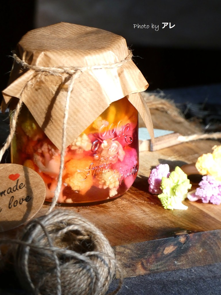 La seconda conserva che volevo assolutamente regalare erano questi bellissimi e fantastici cavolfiori colorati! Non ho resistito affatto al loro fascino, eppure non li sopporto, non amo il loro odore, ne la loro consistenza, tanto meno il sapore ma ho pensato: “e mica li devo mangiare io… ! Ma vuoi mettere che figurone ci faccio presentare questo vasetto multicolor?” Ho scelto meticolosamente quelli col colore più vivo, li ho trattati con delicatezza, un pò in agro e un pò in dolce, e ho catturato il loro gusto, la fragranza e la tinta in un semplice barattolo che fa trasparire tutte le sfumature di una vita da vivere veramente in tecnicolor!