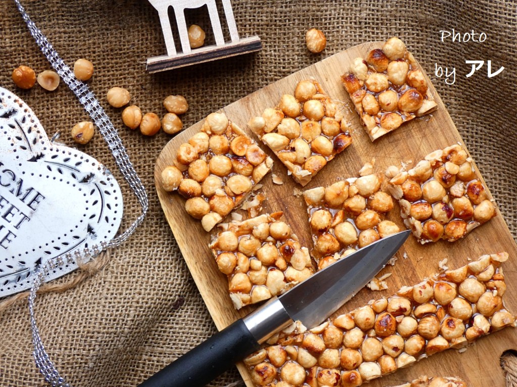 Versare lo zucchero in un padellino antiaderente col fondo spesso ed unire l’acqua. Far sciogliere lo zucchero a fiamma bassa, fino ad ottenere un composto dal colore ambrato. Versare le nocciole nel caramello e mescolare molto bene. Foderare uno stampo quadrato o rettangolare con carta di forno unta con l’olio e livellare bene in modo che non ci siano nocciole sovrapposte. Far raffreddare e rapprendere il composto in luogo fresco. Una volta pronto e ben duro, spostare su di un tagliere e con un coltello affilato tagliare a quadrotti o losanghe