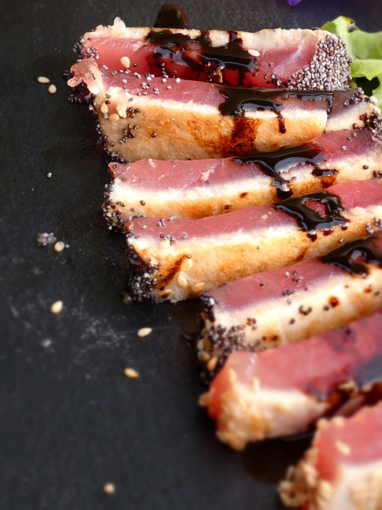 questo piatto è a prova di: non posso farcela…. E’ praticamente già pronto, l’unica cosa da fare bene è scegliere quale pezzo di tonno utilizzare. Ricordate che il tonno a tranci surgelato ha l’unica differenza di poter essere conservato a lungo, per il resto il gusto sarà assolutamente diverso dal trancio fresco, ma in certi casi è più adatto, perché il prodotto surgelato è raccomandato se lo si userà per preparazioni crude come sushi, sashimi o tartar. Le basse temperature sono l’unico modo, oltre alla cottura, per eliminare parassiti come l’anisakis. Per le preparazioni a crudo se si vuole utilizzare pesce fresco, bisogna tenerlo almeno quattro giorni a meno 18 gradi in un congelatore domestico.