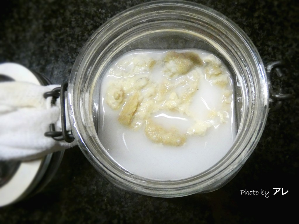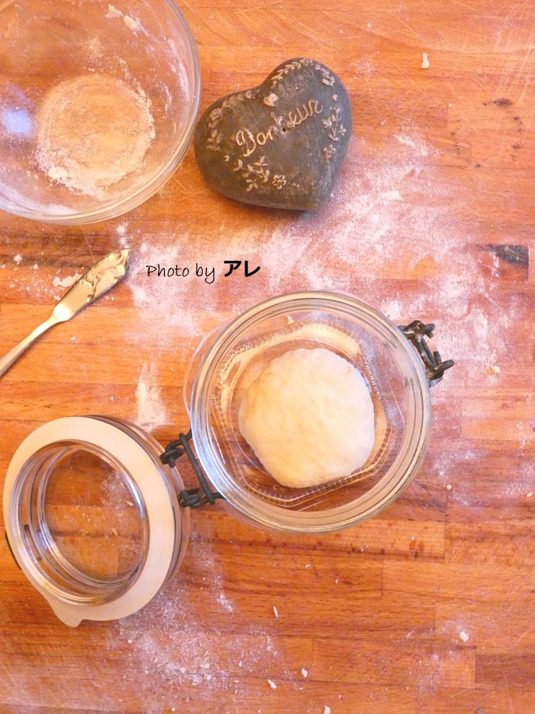 Dopo 48 ore precise vedrete che la pallina si sarà un pochino seccata in superficie diventando giallognola. A vista deve essere asciutta, pulita e ben tesa. Aggiungere 30 grammi d’acqua e ruotate il barattolo tante volte in modo da bagnare la pasta. Abbiate pazienza e continuate a ruotare, poi con un cucchiaino schiacciate molto delicatamente la pasta e continuate a girare. Vedrete l’acqua diventare bianco latte!