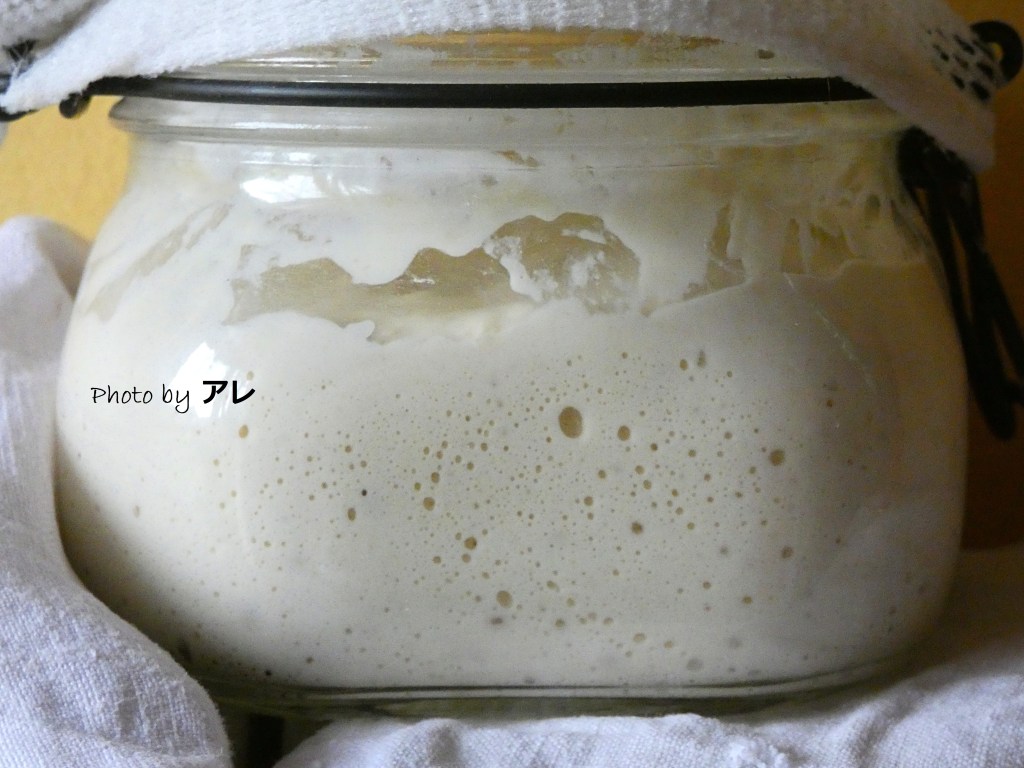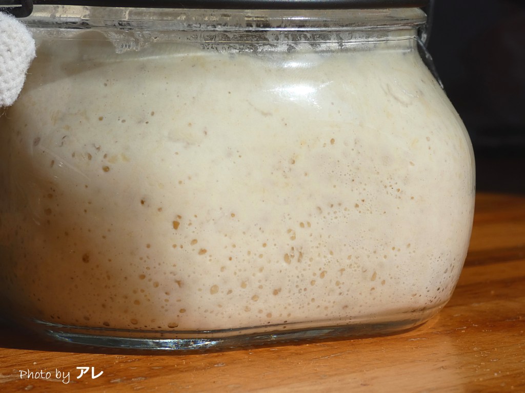 Aggiungere prima l’acqua, mescolate con cura, aggiungete la farina (sempre lo stesso tipo) amalgamate per bene, staccate dai bordi del barattolo il composto e lasciatelo nello stesso posto per 24 ore. Il risultato dovrà sempre essere cosi, ossia gonfio e alveoli ben visibili: