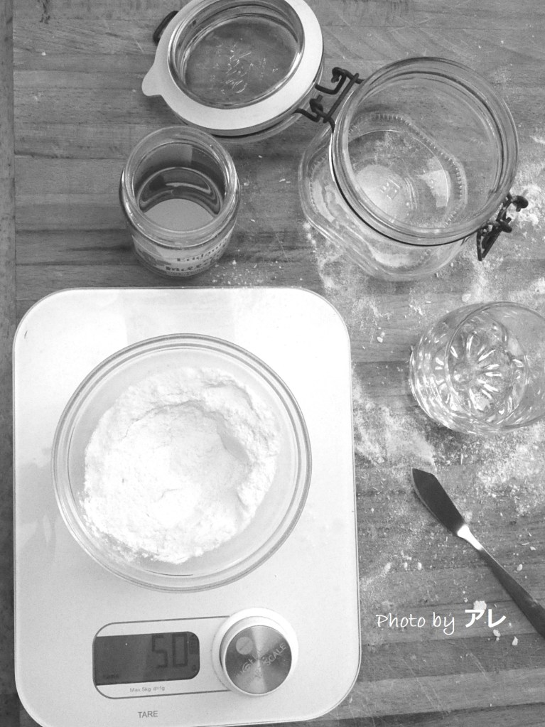 importantissimo seguire perfettamente questi passi senza avere fretta nè saltare i passaggi. La prima cosa è pesare perfettamente i grammi necessari di farina che dovrà essere ad alta resa con una buona percentuale di glutine (per i celiaci che devono assolutamente eliminare il glutine, ma solo per loro, è possibile utilizzare farina di riso o farine appositamente preparate senza glutine), pesare esattamente la quantità d’acqua possibilmente con una durezza compresa tra 20 e 25°f . L’acqua imbottigliata è troppo dolce, ma si può tagliare se quella del rubinetto è troppo dura, e infine aggiungere una goccia di miele, quale acceleratore. Possono infatti essere utilizzati eventualmente degli ingredienti chiamati starter, ossia sostanze zuccherine che avviano e velocizzano il lavoro dei batteri, dato che questi ultimi si nutrono appunto di zuccheri.