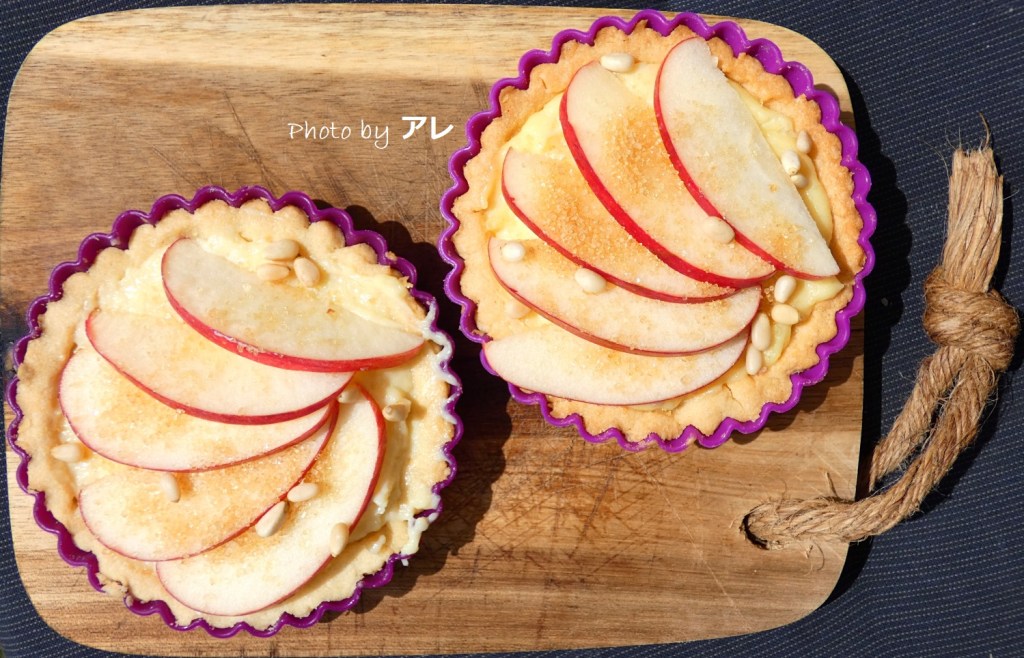 In una ciotola mescolare l’uovo con lo zucchero, poi aggiugnere il burro a pezzetti fino ad ottenere un composto morbido. A piccole dosi aggiungere alla farina, lavorare fino ad ottenere un composto omogeneo. Avvolgere nella pellicola e mettere in frigo per mezz’ora. Stendere la frolla su un piano leggermente infarinato fino ad ottenere uno spessore non troppo basso. Ricavare dei dischi poco più’ grandi degli stampini che userete per le crostatine. Le mie avevano un diametro di 15 cm. Foderate gli stampini con la frolla, dopo averla unta con un po’ di burro, e bucherellate la base. Cuocere in bianco in forno a 180° per 15 minuti. La pasta dovrebbe apparire appena appena dorata. Sfornatele e riempirle di crema pasticcera, aggiungere la mela, lasciando la buccia, tagliata a spicchi, cospargere di zucchero di canna e pinoli e infornare nuovamente sempre a 180° per altri 15/20 minuti o almeno fino a che vedrete i bordi prendere colore.