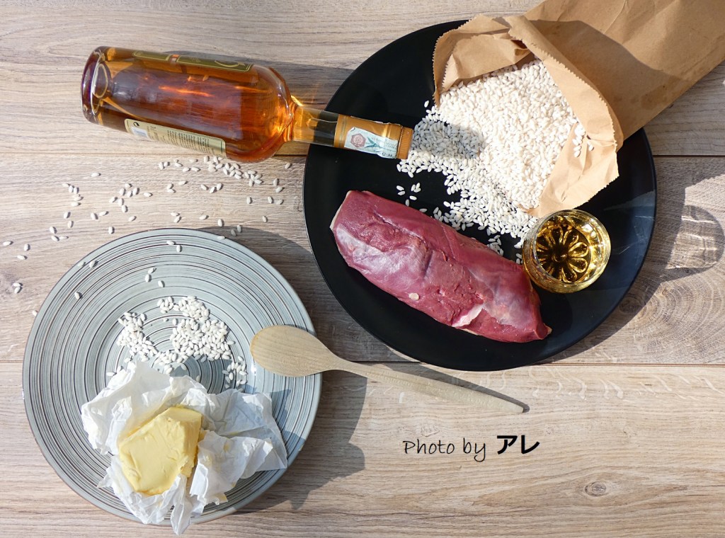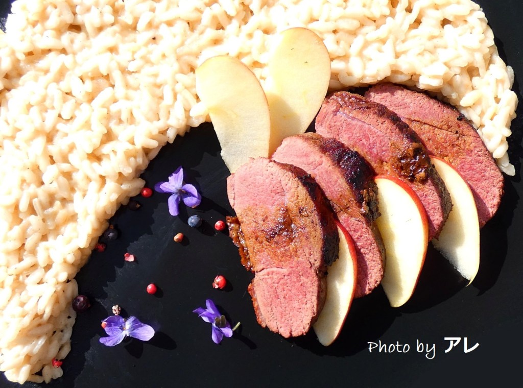 In un tegame per risotto, tostare il riso e sfumarlo con 2/3 di Calvados, abbassare la fiamma e proseguire la cottura del risotto aggiungendo un mestolo di acqua calda precedentemente salata. In una padella antiaderente, scottare il petto d’anatra con il mirto, i grani di pepe e l’alloro: 7/10 minuti sul lato della pelle, 2 minuti dall’altro. Sfumare con il restante terzo di Calvados.