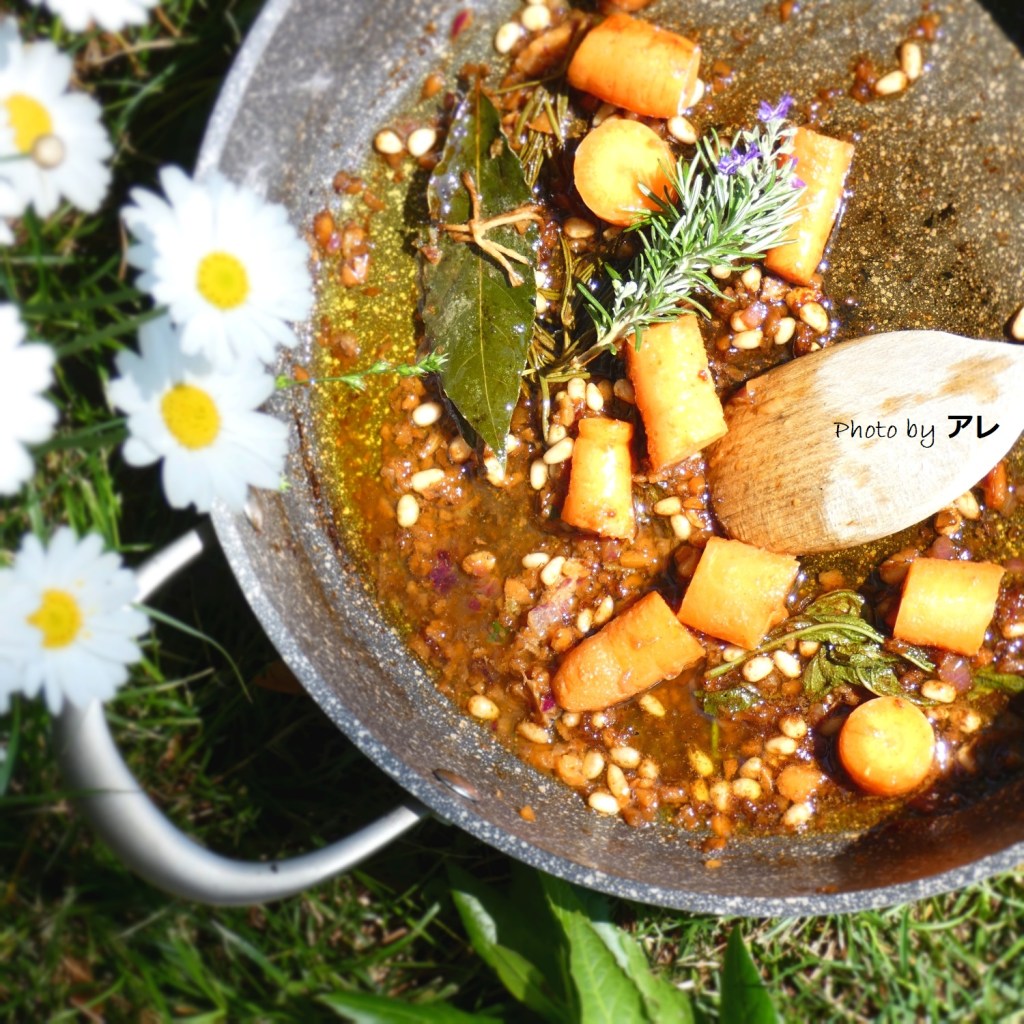 Iniziate a far rosolare la carne di coniglio, dopo averla ben lavata sotto l’acqua corrente, in un tegame ampio che la possa contenere tutta senza sovrapporla. Aggiungete un mazzetto ben legato con spago da cucina di alloro, rosmarino e salvia, un pizzico di sale grosso e appena la carne inizia a rosolare bagnatela con uno spruzzo di aceto di vino bianco. Nel frattempo in un’altra grossa casseruola, scaldare il burro e l’olio e imbiondire la cipolla che non deve bruciare. Aggiungere un mestolo di brodo di carne e l’ingrediente segreto (ahahah). Inserire anche una generosa manciata di pinoli, il rametto di erbe aromatiche utilizzato prima e le carote a tocchetti grossolani.
