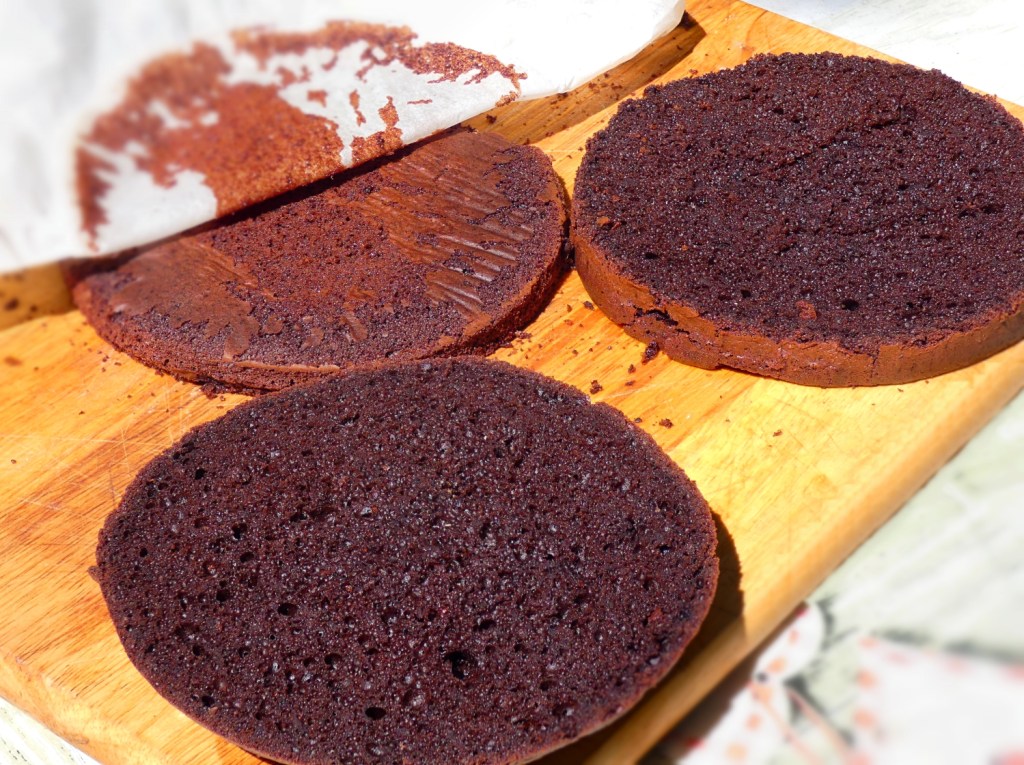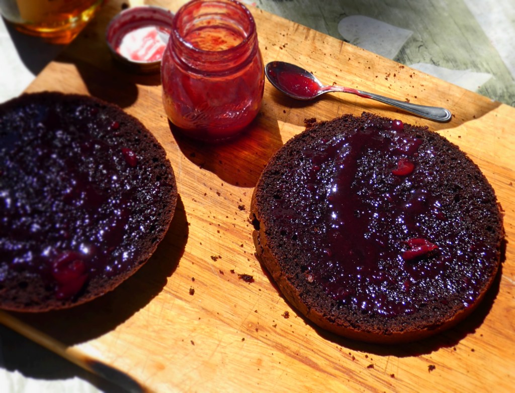 Tagliare in 3 dischi uguali, bagnare con un pennello imbevuto di kirsch o di brandy, spalmare la marmellata di amarene e metterne qualcuna fresca caramellata poi spalmare la panna che avrete montato a neve ferma con lo zucchero al velo, in modo da farne uno strato compatto. Posizionare ora l’altro disco e procedere allo stesso modo. L’ultimo disco è il primo della torta, quello che avrà la parte alta con la crosticina della cottura. Voltatelo sotto sopra, spalmatelo con la marmellata e il liquore, poi rivoltatelo sulla torta come un coperchio.