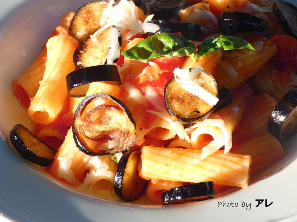 Cuocere la pasta al dente, scolare e versare direttamente nel sugo di pomodoro, mantecare bene. Distribuire metà delle melanzane nella pasta, girare molto bene poi riempire i piatti e condire con il resto delle melanzane fritte e una generosa grattugiata di ricotta salata.