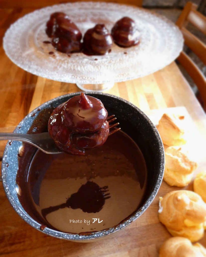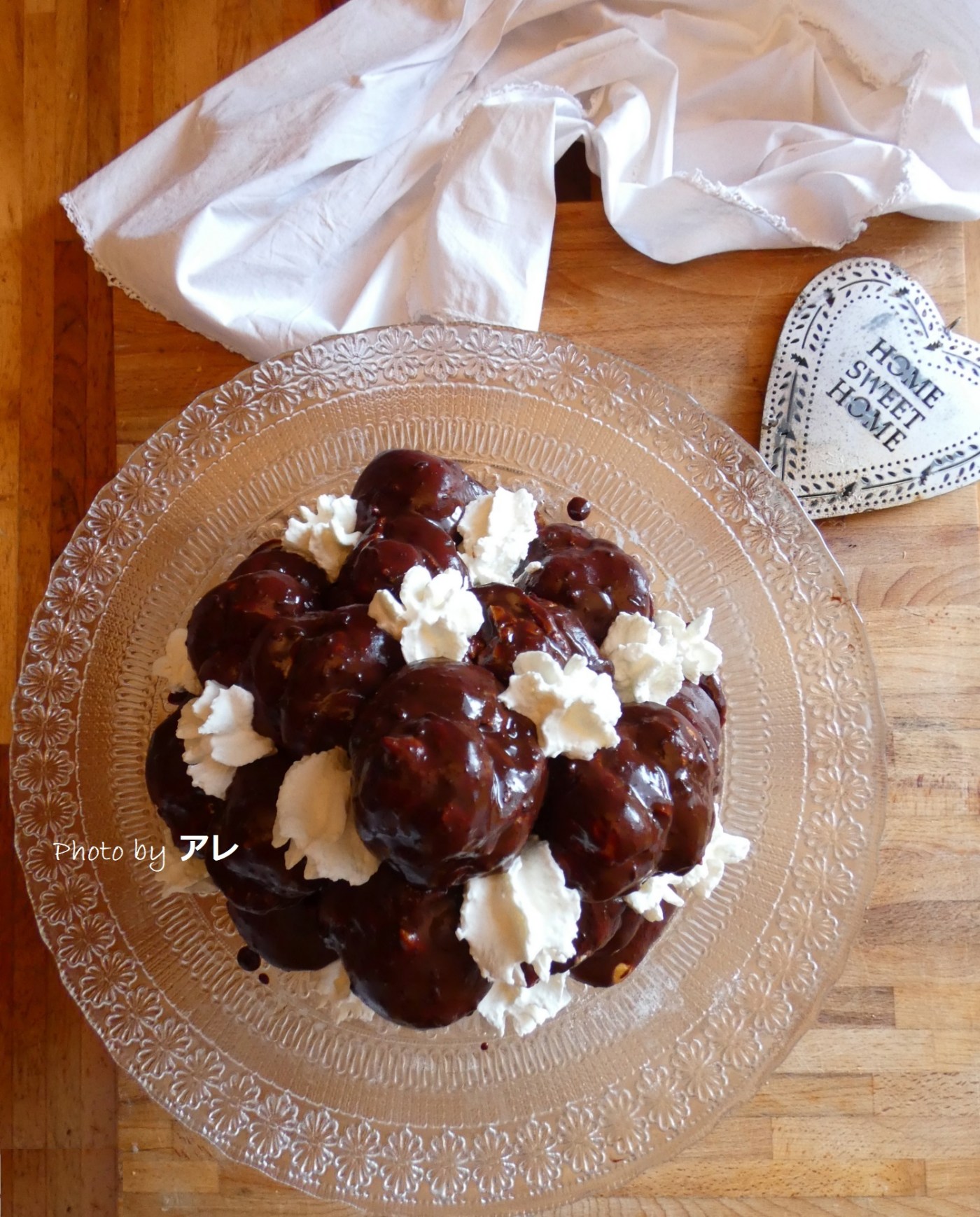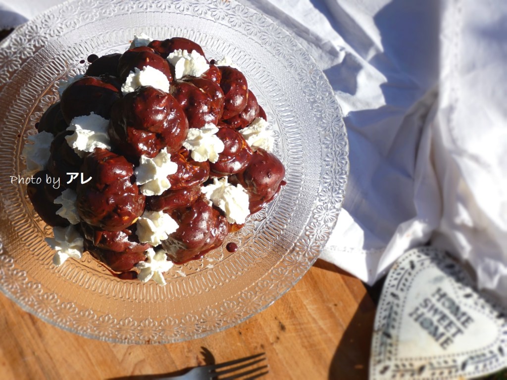 Il termine profiteroles deriva dal diminutivo della parola francese profit, (cioè profitto, guadagno), ed è costituito da una preparazione composta da una serie di piccoli bignè che formano un unico dolce al cioccolato.