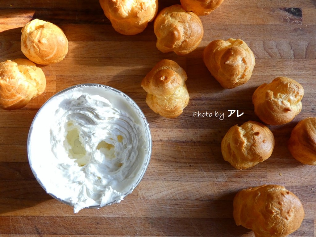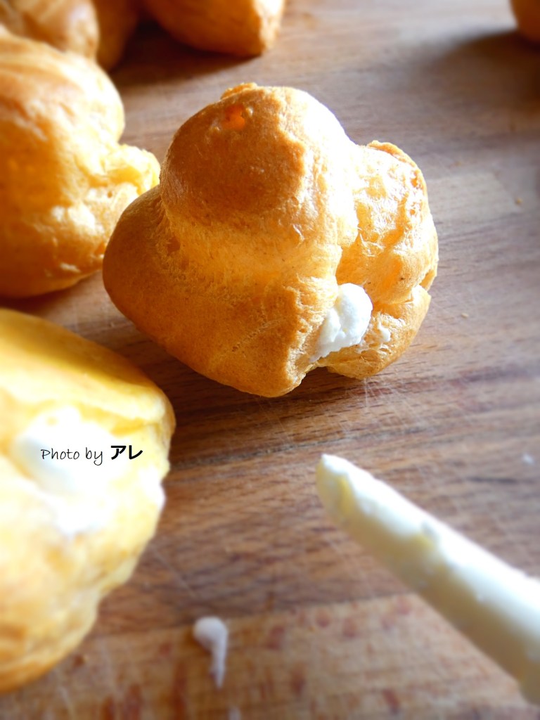 Riempire la sac a poche con la panna o la crema e con una bocchetta lunga fare un piccolo buchino nel bignè e riempirlo.