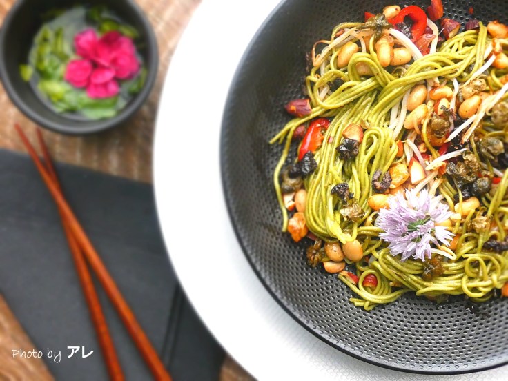Dei deliziosi e curiosi spaghetti verdi (al the verde) con verdure ma con la possibilità, per i più golosi di aggiungere i gamberi. Insoliti, decisamente buoni!