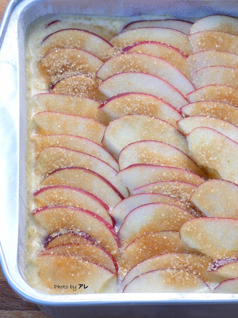 Versare il composto nello stampo, ricoprire tutto con fettine di mela poi cosparse generosamente di zucchero di canna. Cuocere la torta in forno per circa 40/50 minuti. Far raffreddare e servire a quadrotti.