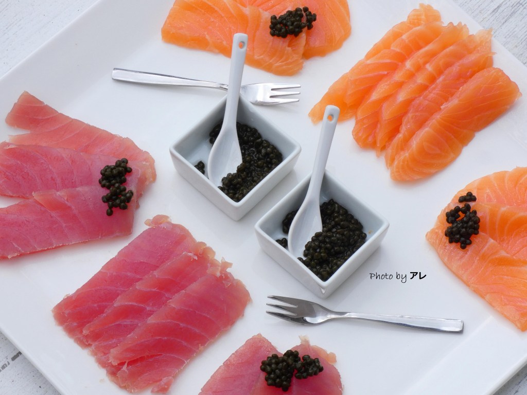 Tagliare il tonno e il salmone freschi e tenuti in frigo fino a pochi istanti prima di servirli, in strisce sottili, appoggiare un cucchiaino di plancton sopra ogni fetta e mangiare subito.