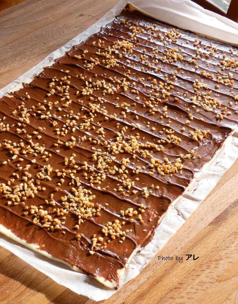 Stendere una pasta sfoglia, spalmare sull’intera superficie la nutella precedentemente sciolta per massimo 30 secondi nel microonde o a bagnomaria. Cospargere di granella di nocciola a piacimento.