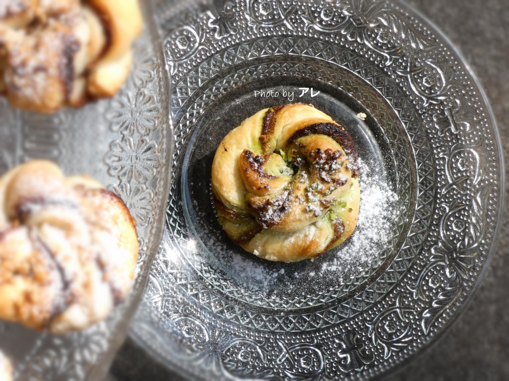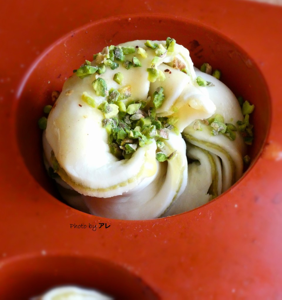 Tagliare a strisce, arrotolare, porre nello stampo da muffin, pennellare di burro fuso, cospargere di granella di pistacchi e cuocere allo stesso modo.