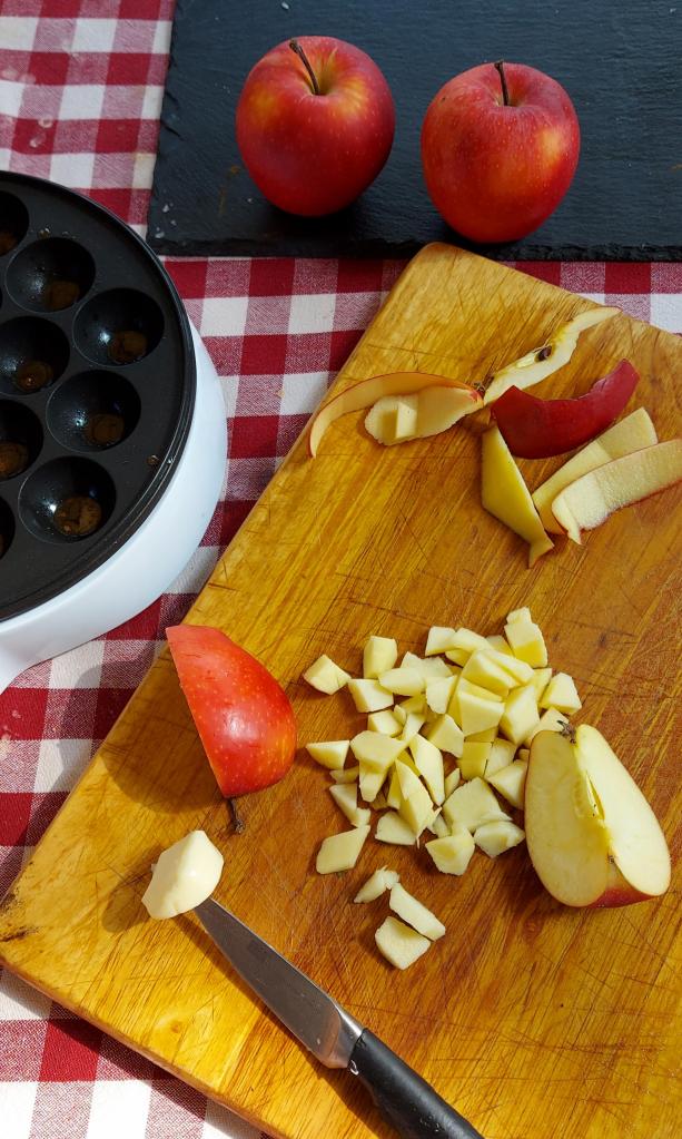 Sbattere l’uovo intero con un cucchiaio di zucchero fino ad ottenere un impasto spumoso, aggiungere la farina bianca, il pizzico di sale e il latte. Quando la pastella sarà liscia e morbida lasciarla da parte e sbucciare la mela tagliandola a pezzetti piccoli anche irregolari. Accendere la padella per i Takoyaki e quando sarà calda sciogliere in ogni incavo un pezzetto di burro. Riempire ogni incavo con la pastella fino quasi al bordo, aggiungere i pezzetti di mela, abbondanti e aspettare che la mezza sfera sia pronta, circa 6/7 minuti.