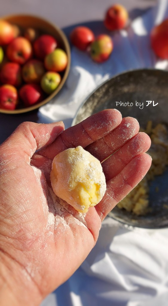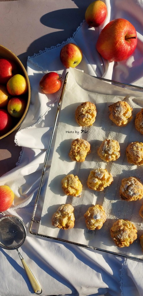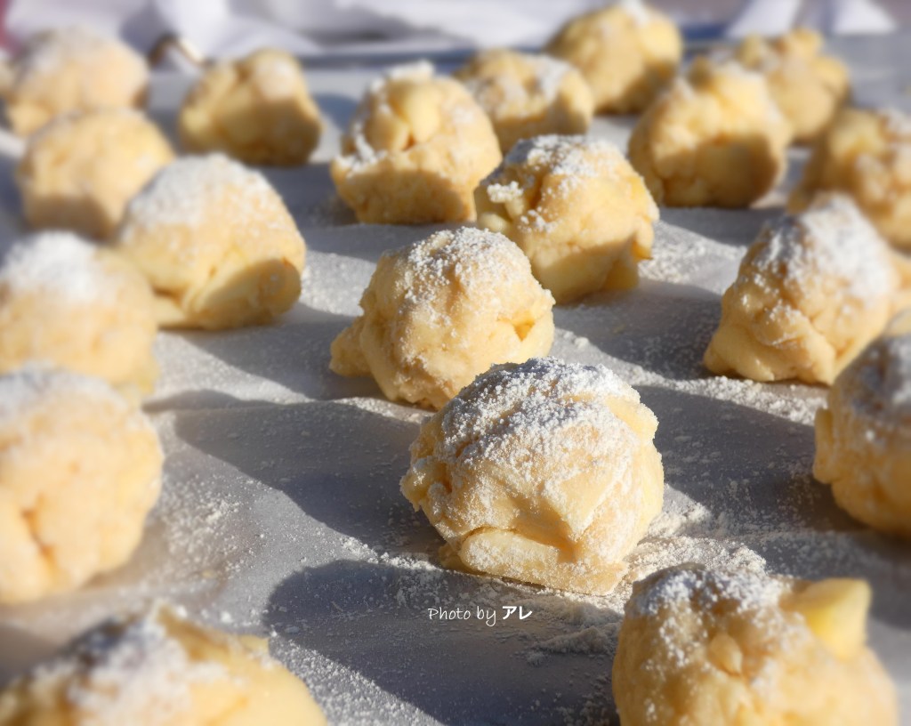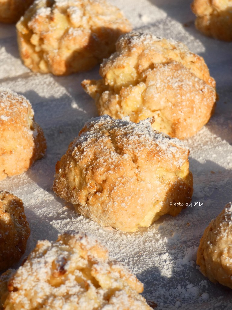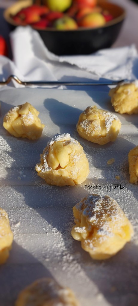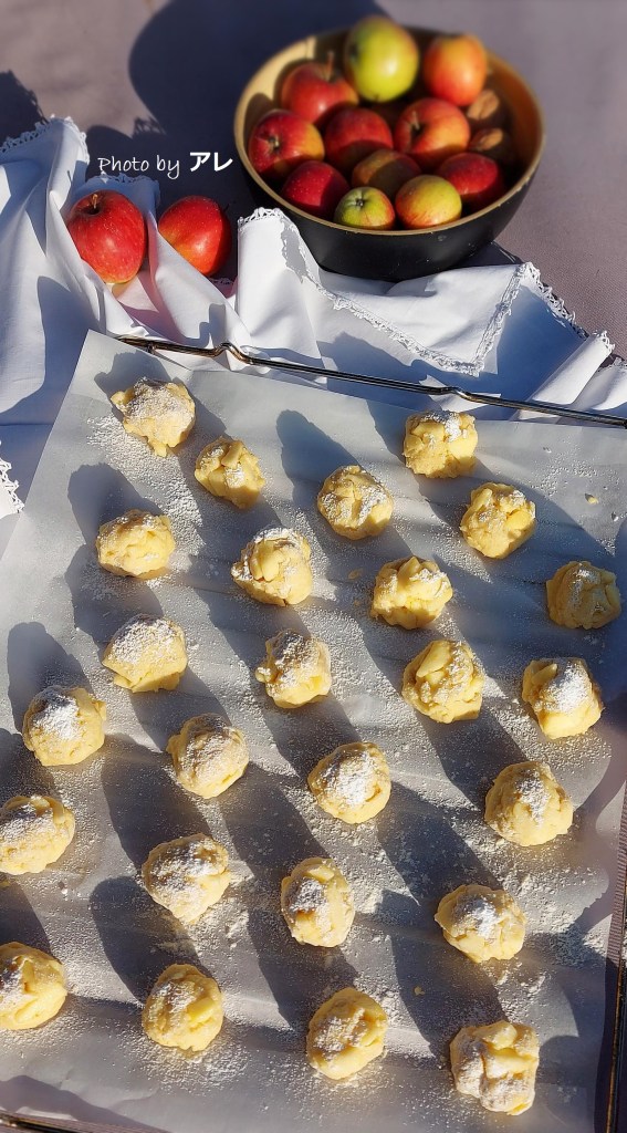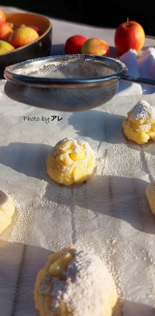Quando si raggiunge una consistenza granulosa e morbida, aggiungere metà delle mele e incorporarle con calma alla pasta, poi aggiungere tutte le altre scolate dal liquido del limone e miscelare con cura. Accendere il forno a 180 gradi. Infarinarsi generosamente le mani e prelevare una noce di impasto, farla roteare nelle mani e formare una pallina (grande come quella da golf più o meno), appoggiarla su carta da forno pronta su di una teglia.