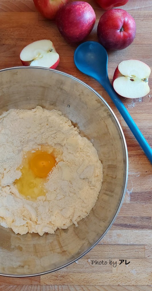 Sbucciare le mele e tagliarle a dadini piccoli, riunirle in una ciotola capiente e irrorarle con il succo di mezzo limone. In una ciotola mettere la farina, il lievito e lo zucchero. Miscelare bene e unire il burro tagliato a dadini, iniziare ad impastare con le mani. Se potete evitare il robot o le fruste è meglio! Aggiungere l’uovo e amalgamarlo con il resto della pasta.