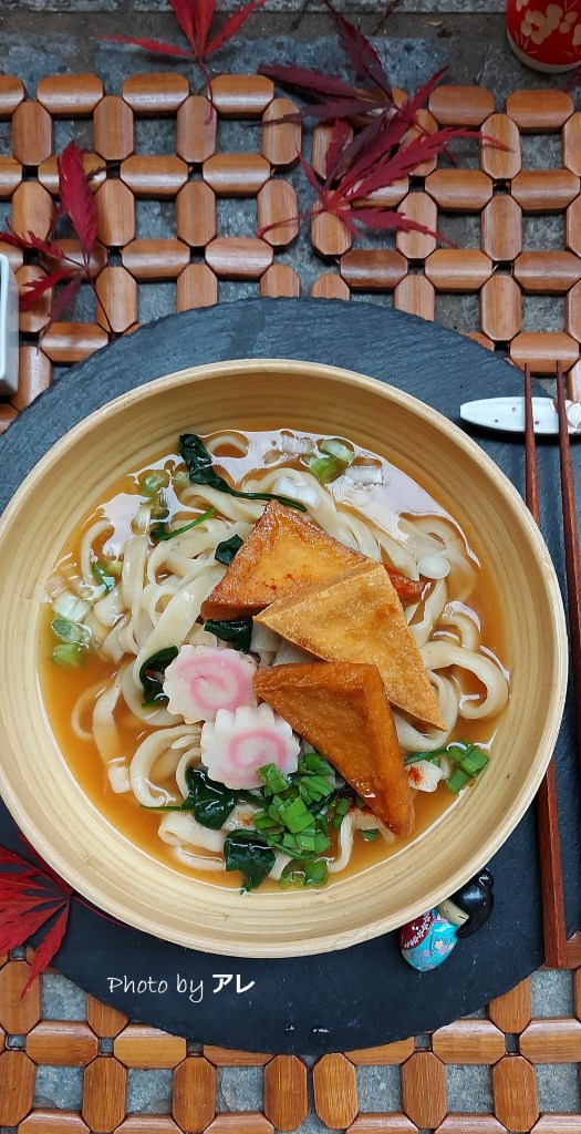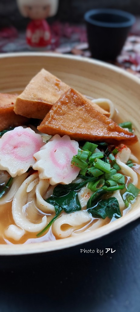 La volpe, in giapponese kitsune 狐, riveste nella cultura giapponese un ruolo importante. Si trova spesso all’ingresso dei santuari shinto, a testimonianza che in essi è ospitato il kami (divinità) Inari. Le kitsune sono i messaggeri di Inari, e si dice che siano ghiotte di tofu fritto. Una teoria dice che l’aburaage (tofu fritto) appare spesso come il cibo preferito di una volpe nei racconti popolari giapponesi, quindi la gente ha iniziato a chiamare la zuppa di noodle udon condita con tofu come “kitsune udon”. Per questo motivo questo piatto prende il nome di “Kitsune udon”, avendo al suo interno una fetta del cibo preferito delle volpi giapponesi.