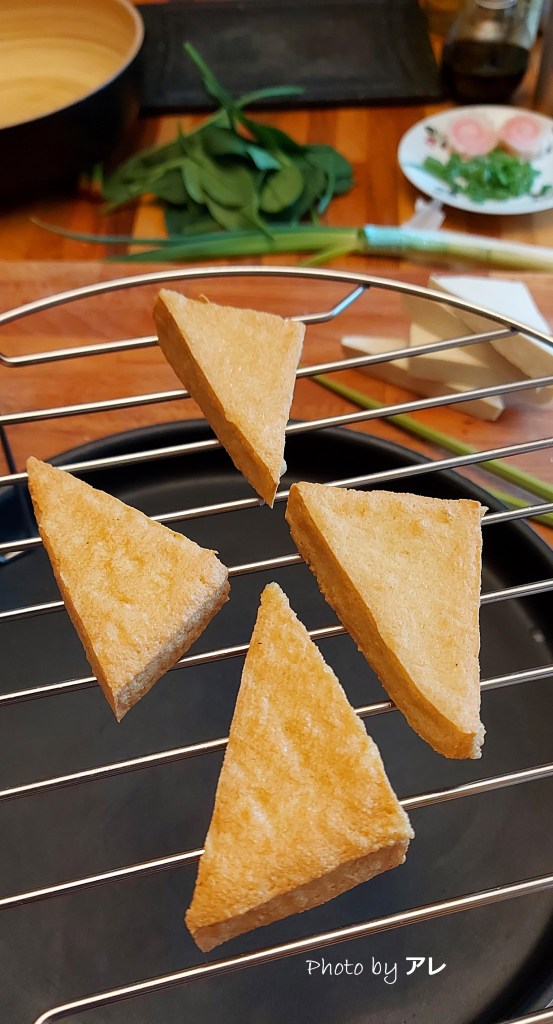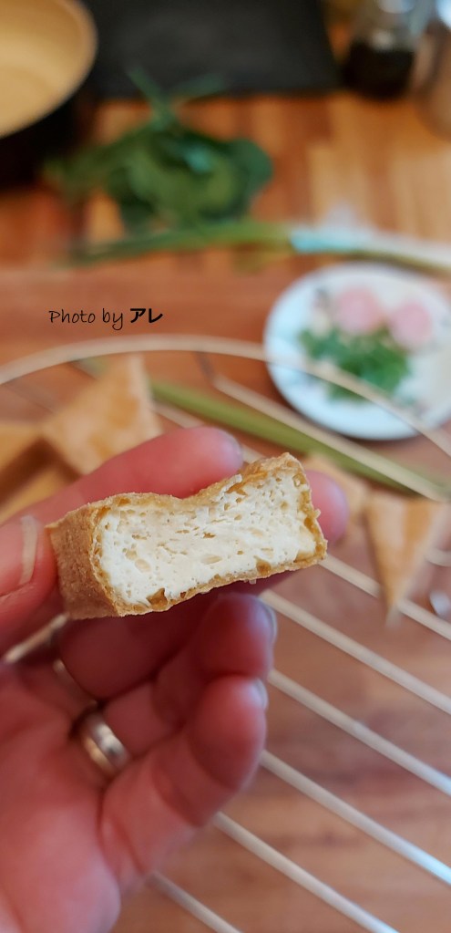 Tagliare il tofu in orizzontale in modo che abbia uno spessore di 3mm. Asciugarlo bene con la carta da cucina e friggerlo con olio a bassa temperatura (110°C) per 2 minuti. Mettere il tofu sulla carta da cucina e portare la temperatura dell’olio nella pentola fino a 180°C. Rimetterlo nell’olio e friggerlo nuovamente per 2-3 minuti finché non si dora in superficie. Metterlo su un setaccio e versarci sopra dell’acqua bollente per togliere il grasso in eccesso. Pressarlo bene per togliere l’acqua in eccesso. Mettete 200ml di brodo dashi nella pentola e portare ad ebollizione. Aggiungere il tofu fritto e cuocere per 2 minuti a fuoco medio. Aggiungere lo zucchero e continuare a cuocere per altri 2 minuti. Aggiungere il sake e la salsa di soia e cuocere finché il liquido non è del tutto evaporato.
