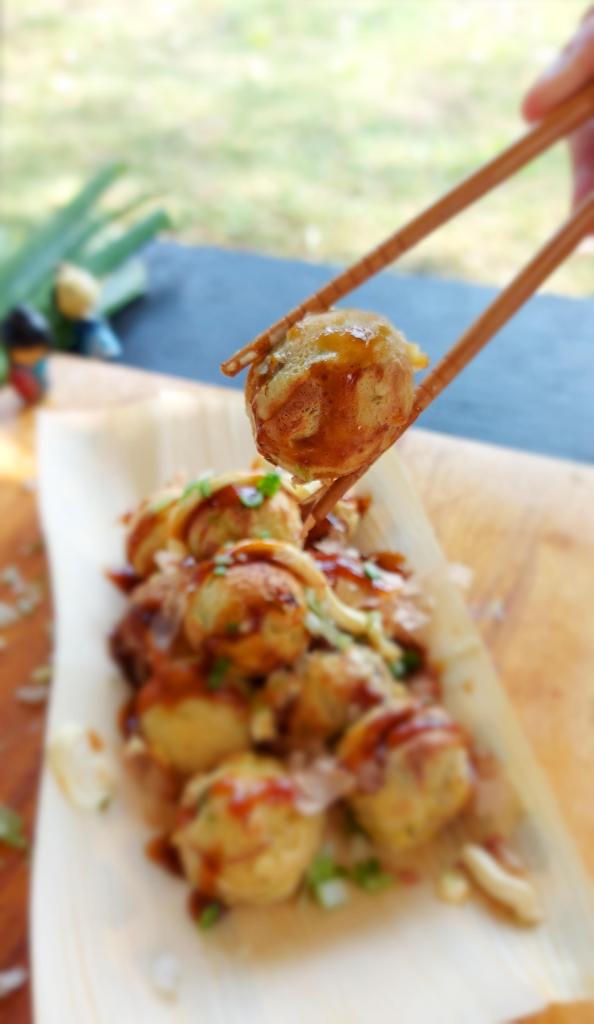 Se manca pastella o le palline sono troppo piccole aggiungete ancora pastella che si legherà e aumenterà la dimensione delle palline. Una volta cotte vanno disposte nelle barchette di carta o vassoietti monoporzione e cosparsi di cipollotto, salsa Otafuku, fiocchi di katsuobushi e maionese.